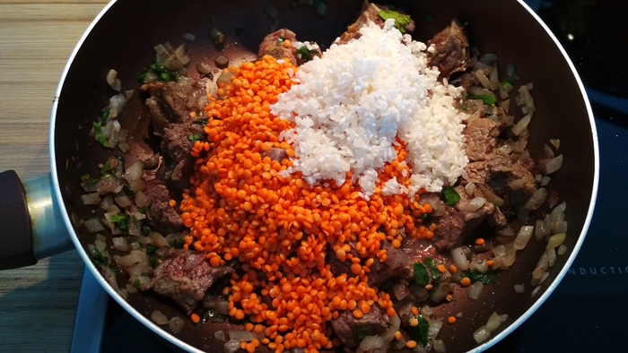 Добавляем промытые чечевицу и рис.