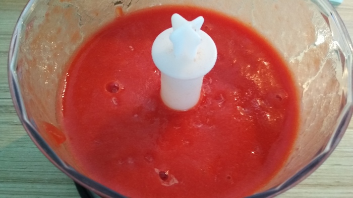 Пока мясо остывает, блендером пюрируем томаты или спелые помидоры с половиной чайной ложки соли.