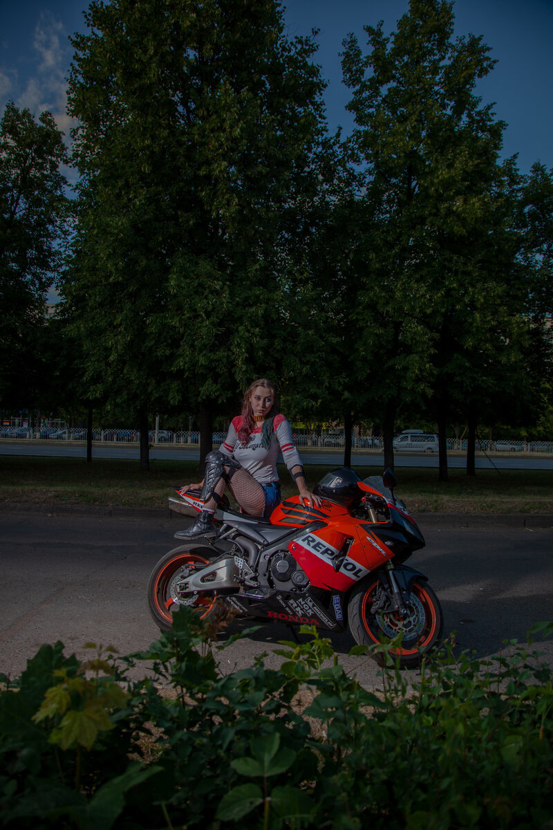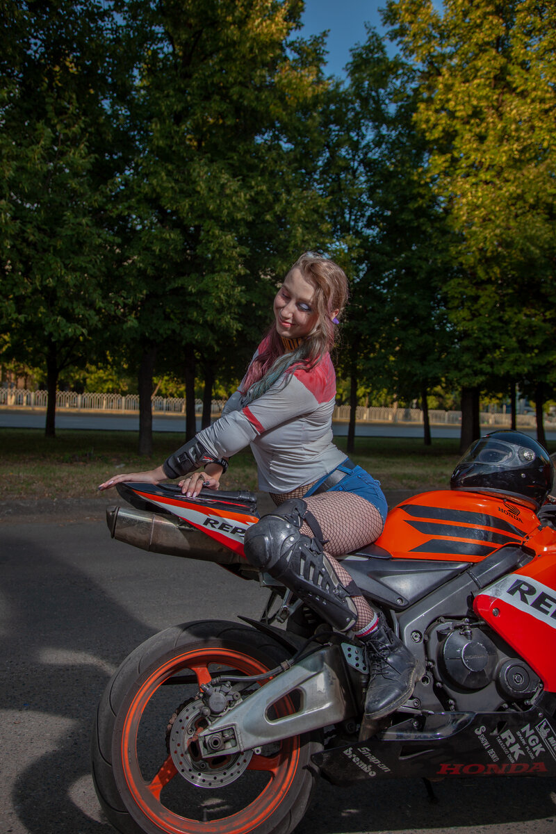 Харли Квинн стояла у спортивного мотоцикла Honda Repsol.