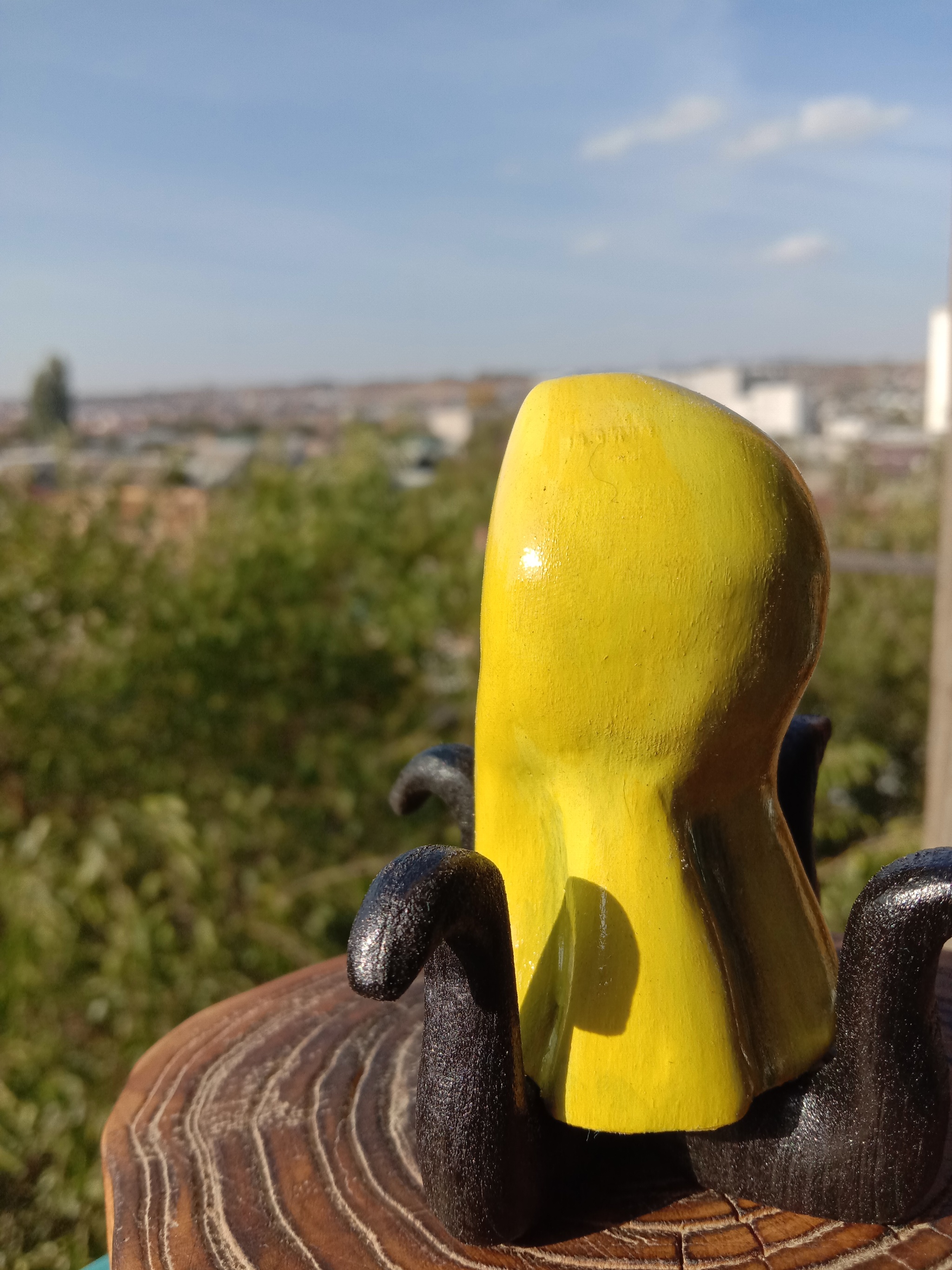Красить решено акрилом, потому что он есть, и почему бы и нет. Крашу я, к слову, ещё хуже, чем пилю. Щупалки просто в черный, верх фигурки в жёлтый с градиентом (в моем случае, просто пачкаю на сгибах и радуюсь тому, что хотя бы глаз не запорол)