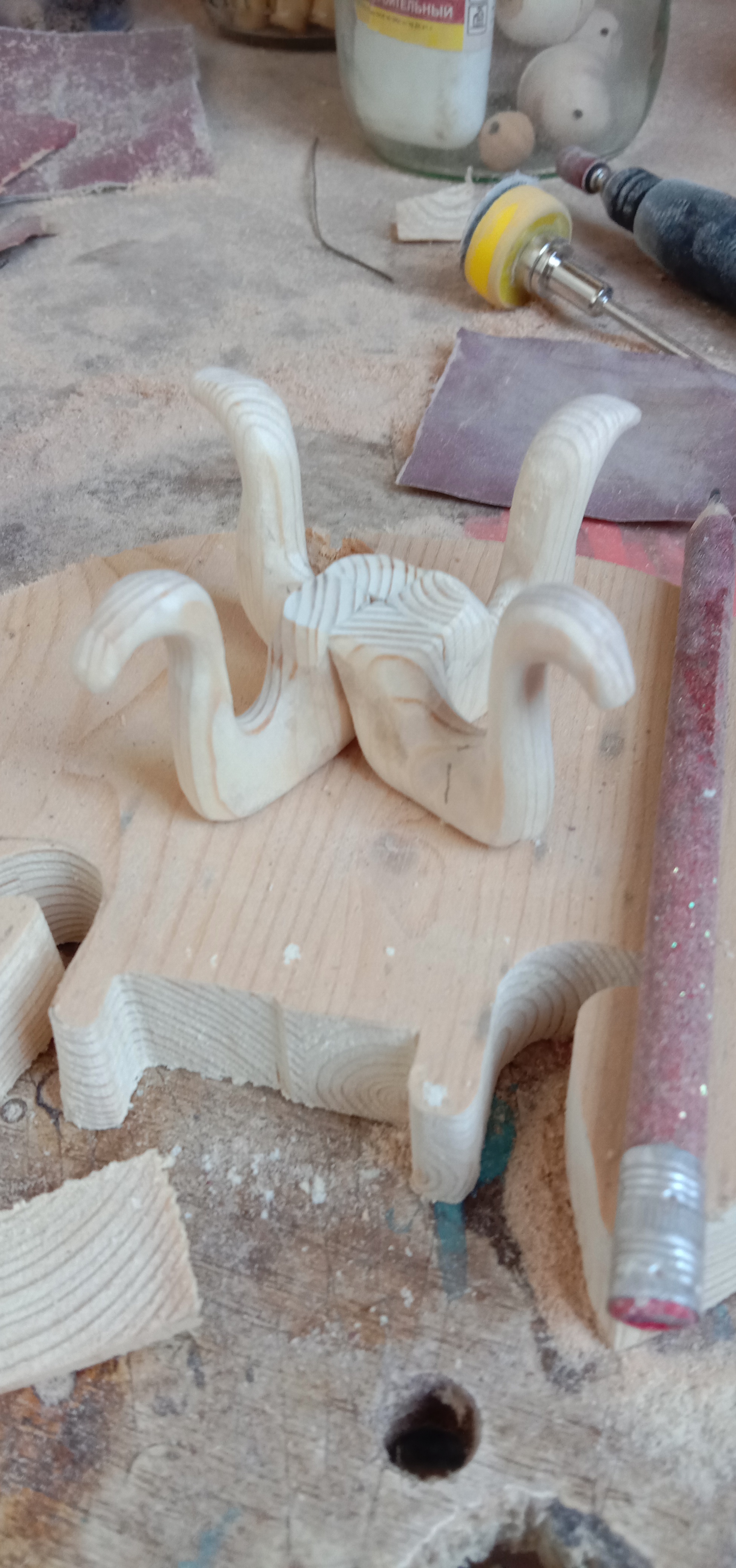 Шлифуем, проклинаем, беремся за щупалки. Нашел кусок соснового щита, из него вырезал четырёх жирных лебедей
