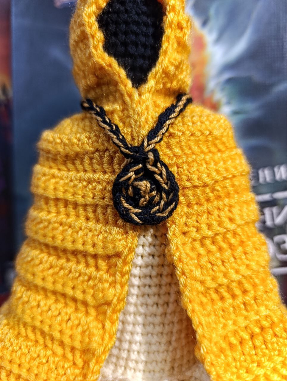 Место лица я связала полностью черным, чтобы создать эффект густой тьмы под капюшоном. Ещё я сделала мини корону для него, но посмотрев итоговый вариант, когда корона на голове, поняла, что она лишняя.