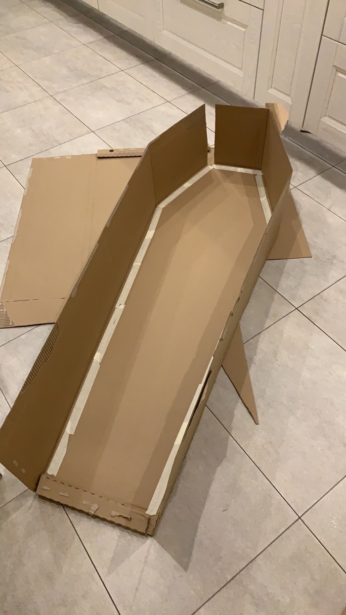 Делаем выкройку нижней части гроба, измеряем и делаем выкройку боковин, вырезаем и клеим на супер-клей, не забывая укреплять стыки рёбрами жёсткости из остатков картона. Не жалеем картон и супер-клей, конструкция должна быть основательной и не развалиться в процессе транспортировки и праздника !