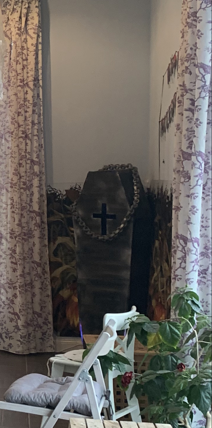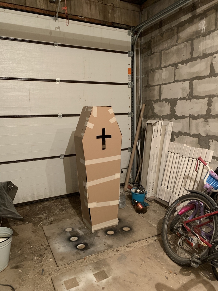 Каждый год мы с детьми и соседями празднуем Хеллоуин. С прошедших праздников осталось много декора, но захотелось чего-то нового и эпичного, делать статую из бетона мы уже не успевали, поэтому было решено сделать гроб из картона.