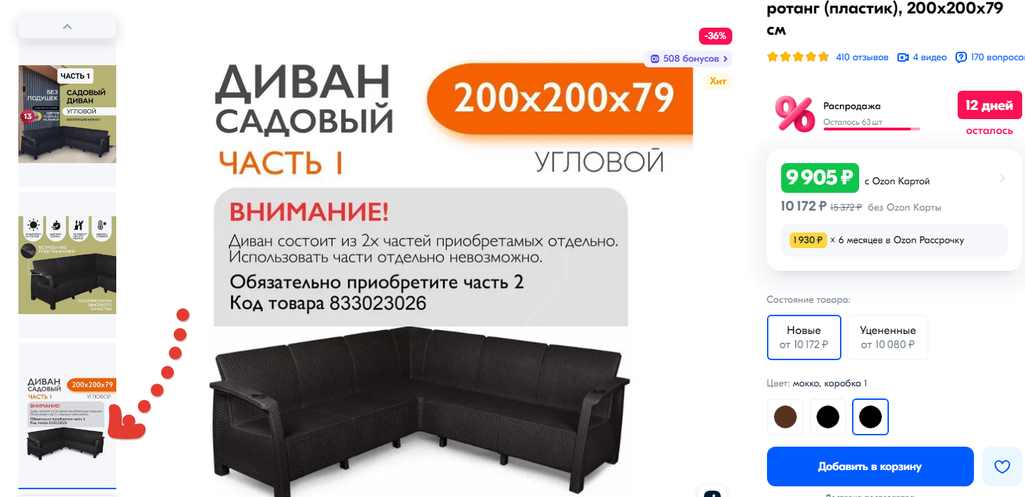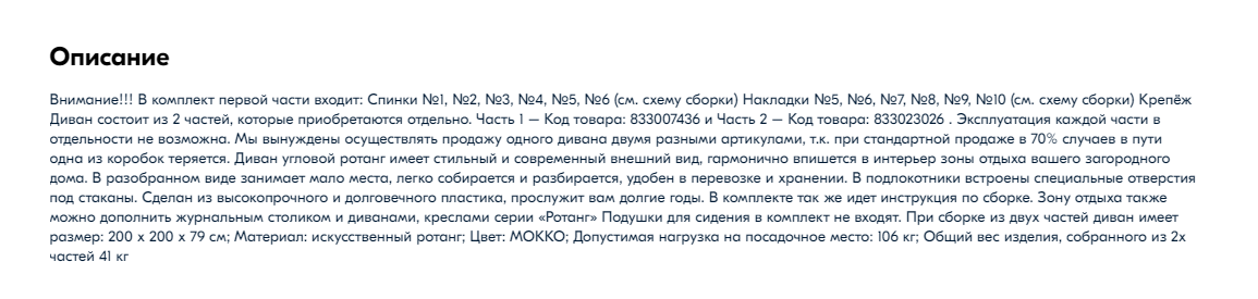Пролистав еще 2 экрана можно увидеть описание, где шрифтом в 10pt достав лупу можно прочитать, что диван некомплектный и это обусловлено тем, что озон регулярно теряет вторую коробку. Т.е. еще и озон виноват, а бедному продавцу приходится так изощряться с продажей своего замечательного товара.