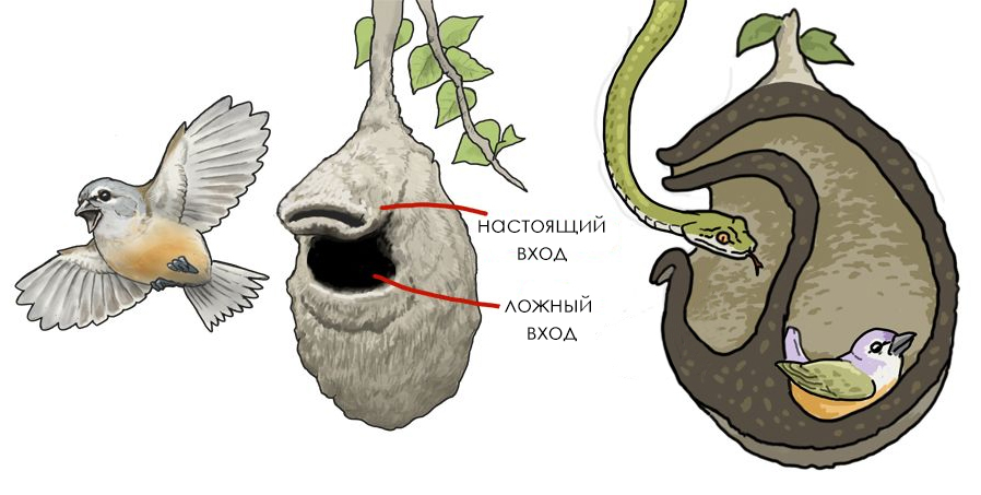 Некоторые виды птиц из семейства Ремезовые строят совершенно уникальные по хитроумности гнёзда, чтобы защитить потомство от змей.