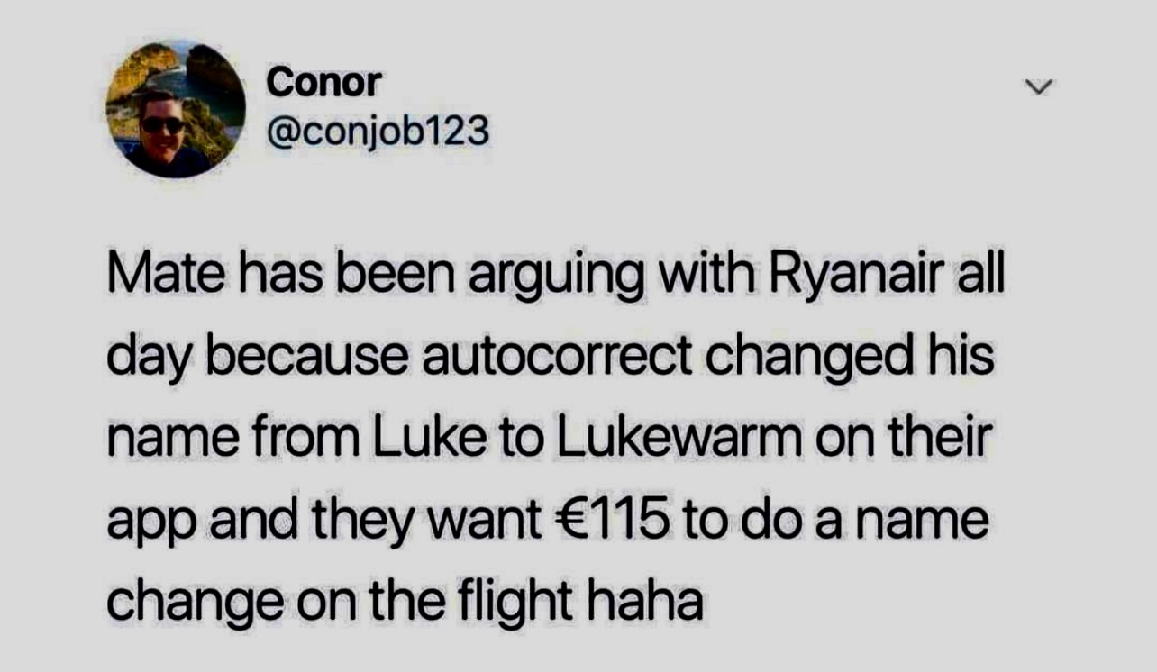 Мой приятель спорил с Ryanair весь день, потому что автозамена в их приложении заменила имя Люк (Luke) на едва тёплый (тепловатый) и они хотят €115 чтобы сделать смену имени пассажира полёта
