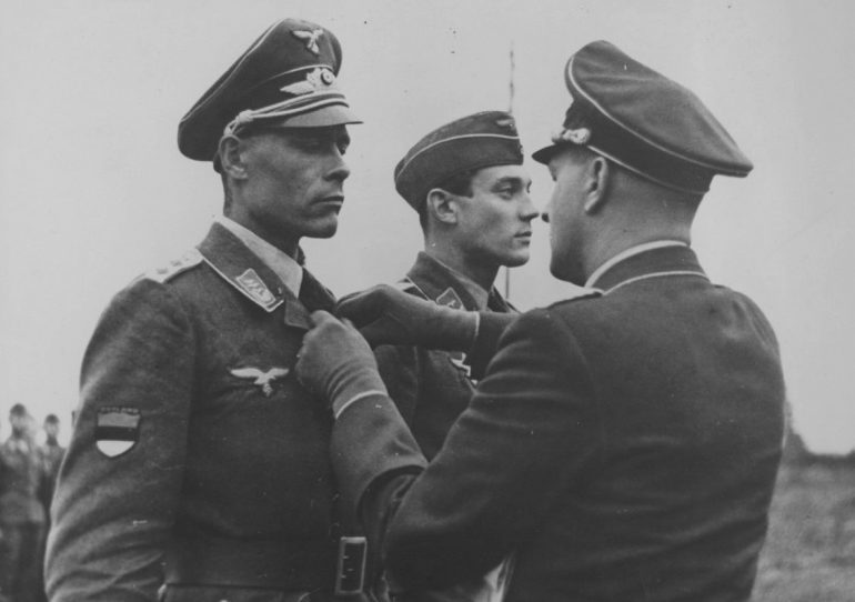 Награждение эстонского пилота Люфтваффе в звании гауптмана Железным крестом 2-го класса. 1943 г.