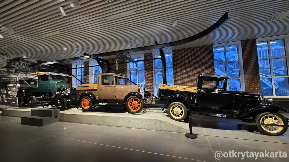 Отдельное пространство посвящено Форду и его главному изобретению — конвейеру. Здесь воссоздан фрагмент сборочной линии. Именно на конвейере выпускали унифицированные шасси, которые потом превращались в десятки модификаций: от легковых автомобилей до грузовиков и спецтехники.