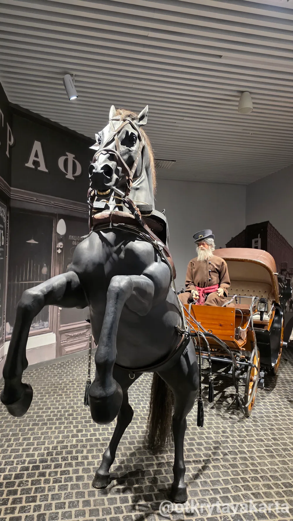 В холле есть фотозона с каретой, кучером и лошадью — рядом висят плащи и цилиндры, можно примерить образ начала прошлого века.