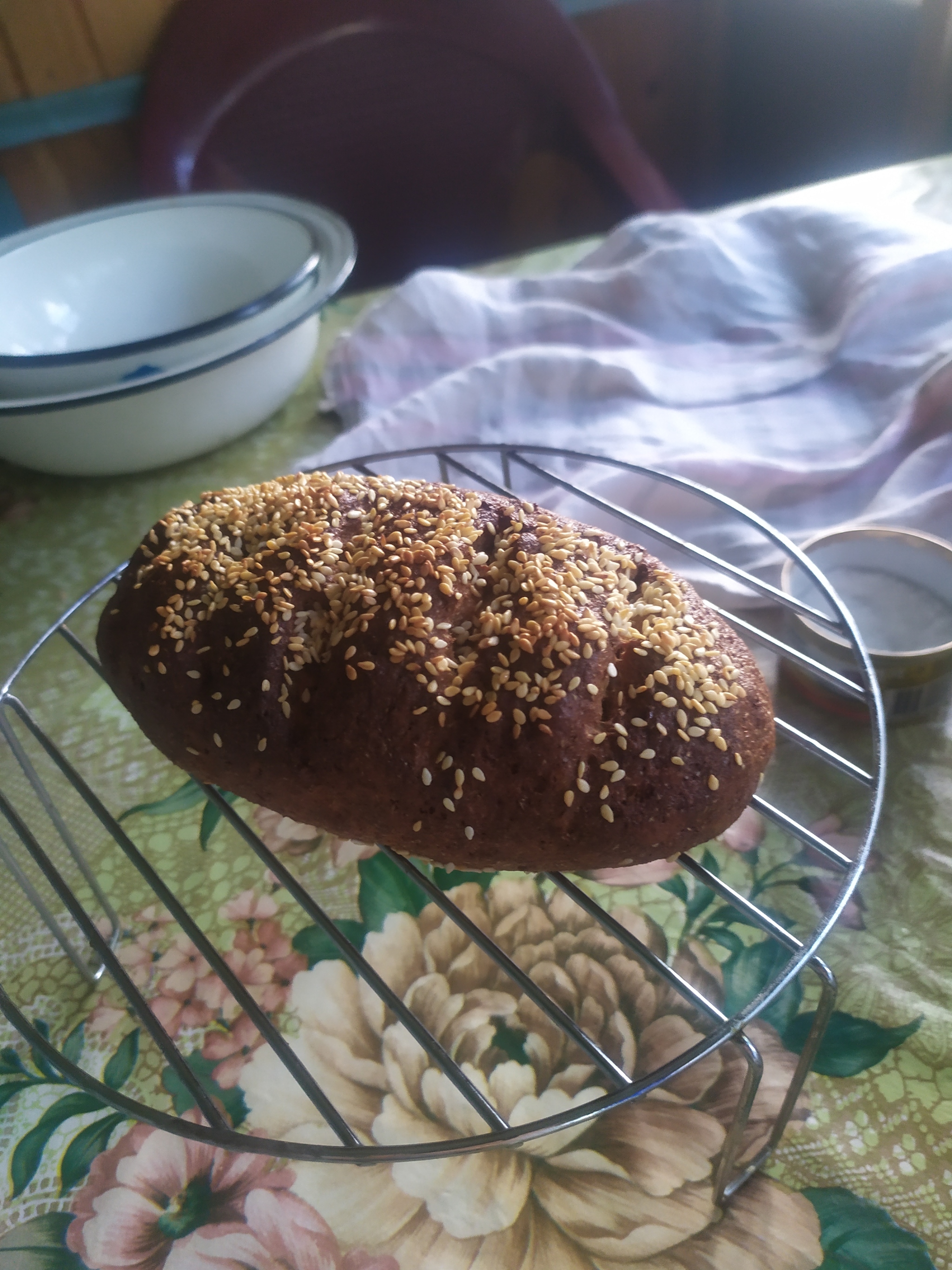 Сформовать хлеб, работать с ним удобно руками, смазанными растительным маслом, я использую нерафинированное полсолнечное, оно заодно и приятный запах хлебу добавляет, можно посыпать кунжутом, молотыми семенами конопли, семечками, семенами льна. Или ничем не посыпать,на ваш вкус. Поместить в негорячую духовку и выпекать минут 30 при 150 -170 гр.