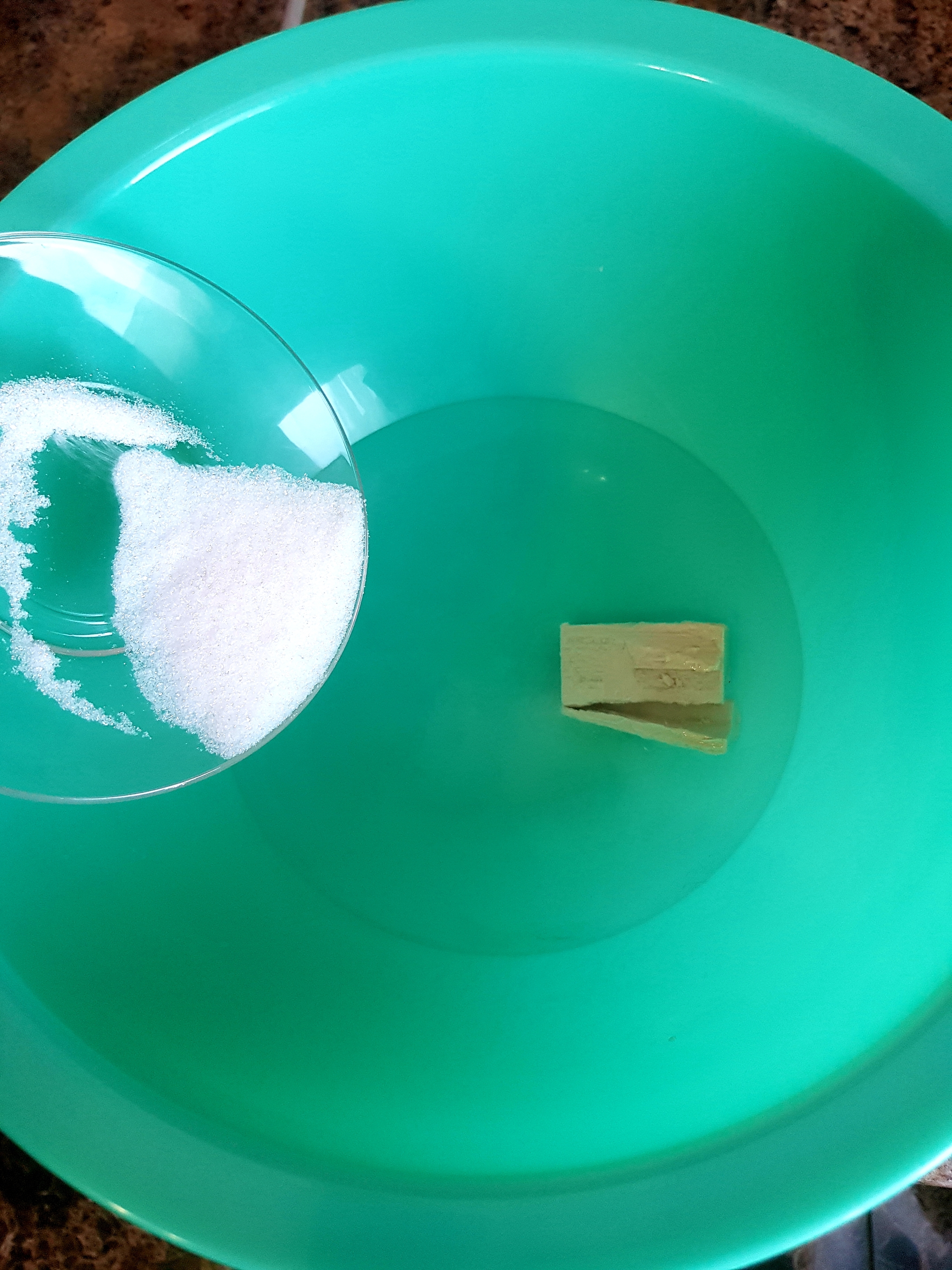 Взял тазик, налил тёплой воды из-под крана, положил дрожжи, засыпал сахар.