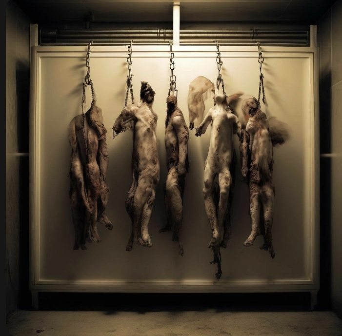 "Сука, выпусти меня отсюда»! - надрывался я. Поняв, что колотить в дверь бесполезно огляделся и вот тут-то ужас накрыл меня с головы до ног, словно я выкупался в липком море дневного кошмара, повсюду в холодильнике на крюках висели люди, вернее даже не люди, а их трупы, целиком и по частям, они были покрыты инеем, словно бараньи туши на холодильном складе. Да это и был холодильный склад. Наверное, стоило задуматься о себе, что-то предпринять, а что можно предпринять, задохнувшемуся от страха пареньку в железной комнате заполненной замороженным человеческим мясом. Не знаю, возможно, именно в тот момент я немного повредился в рассудке, сел в углу этого морозильника и впал в какой-то странный ступор, мне не было даже холодно, мне было просто никак, совершенно никак, и совершенно все равно. Как только я открывал глаза, я видел покрытую инеем женскую ногу, на пальцах ноги угрюмо посверкивал матированный инеем темнобордовый лак. После этого я снова закрывал глаза и уходил далеко в себя оставляя тело замерзать в этом гробу. Не знаю, что вернуло меня. Наверное холод. Он все таки пробрался под мою майку Motorhead "1916" и черепа Lemmy, Wizzo, Philthy и Wurzel покрывались серебристым инеем.