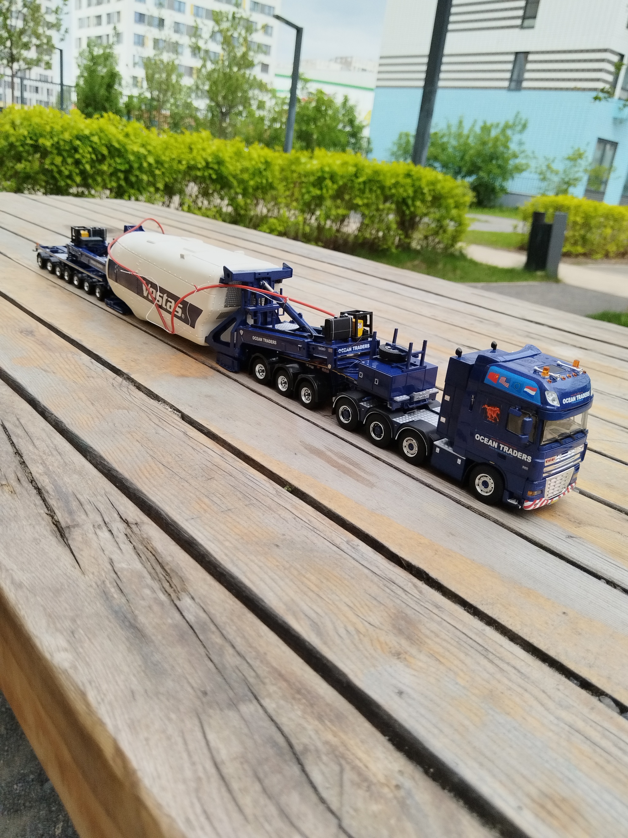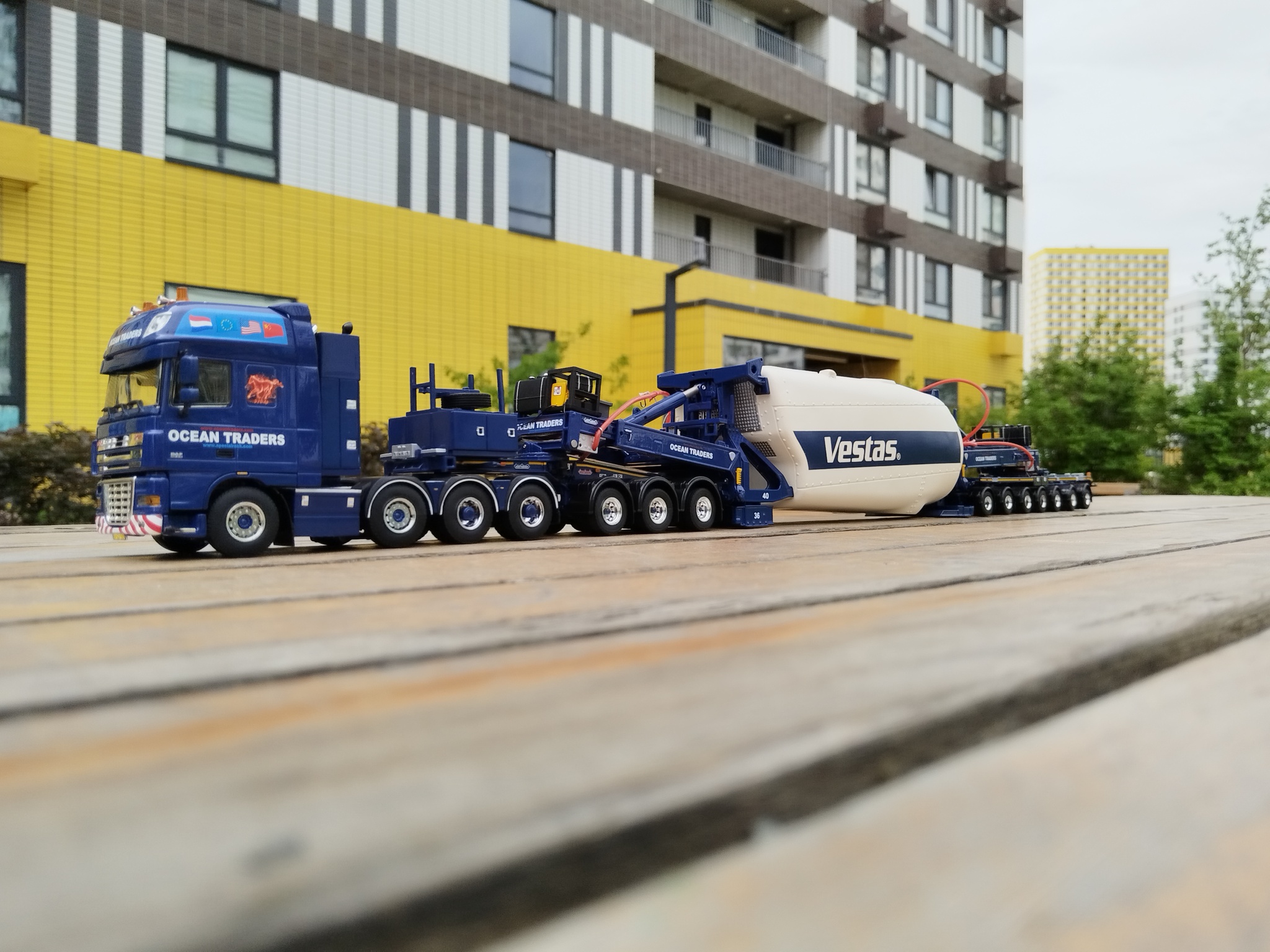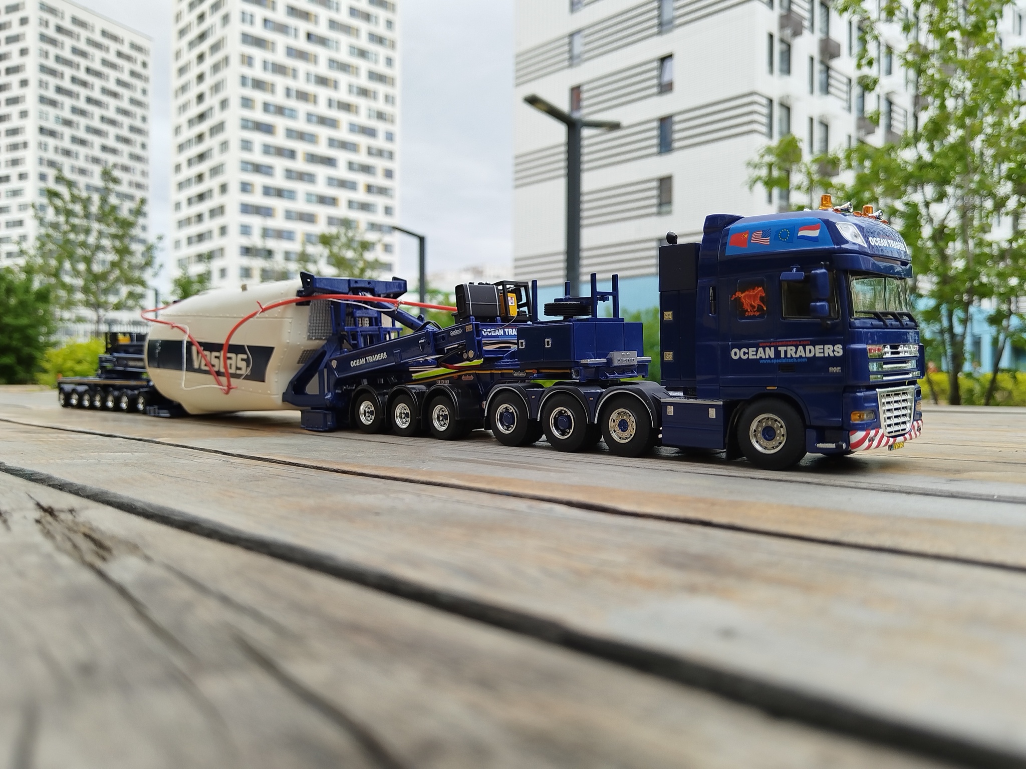 Ливрея OCEAN TRADERS. Тягач DAF XF 105 SSC + FTM / Nooteboom MWT( mega wind mill trailer/прицеп для перевозки башен, колонн и гондол)) + Turbine турбина.Производитель WSI 10055. Масштаб 1:50.