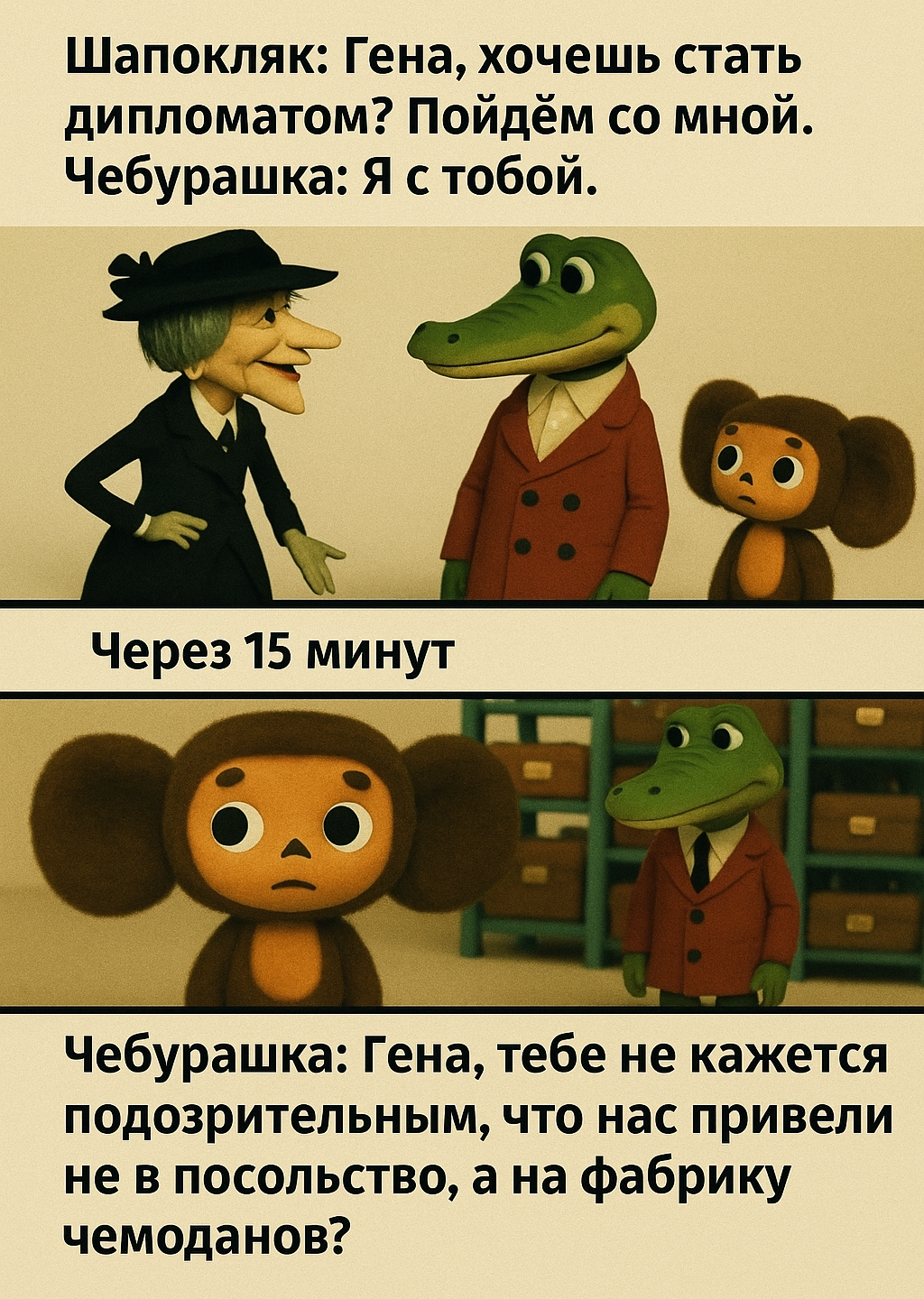 1409 WildKOT2022 Юмор для всех и каждого Хочешь стать дипломатом? 6 месяцев назад [моё] Юмор Чебурашка Черный юмор Арты нейросетей Нейронные сети Анекдот Крокодил Гена 50 4 4 2 Ещё 0