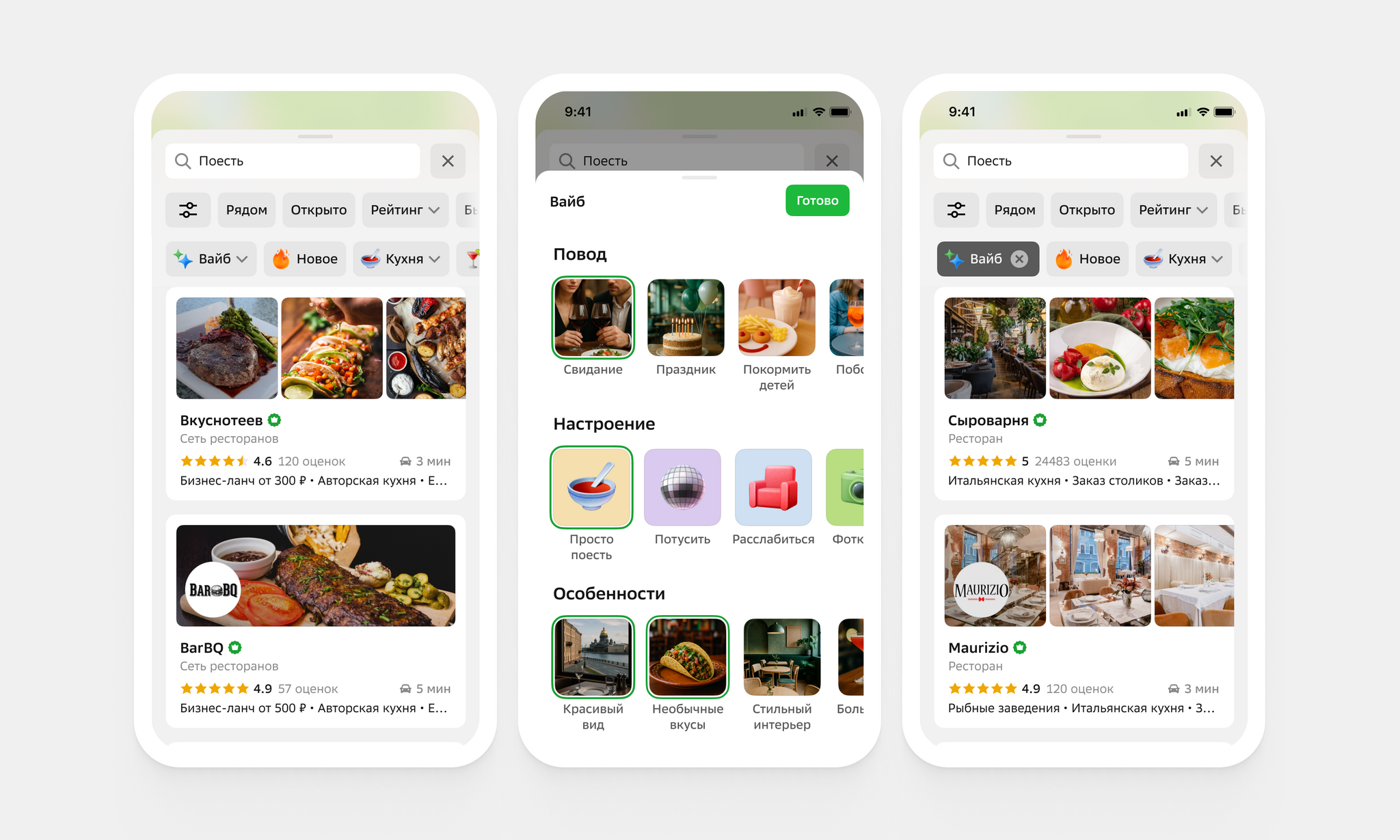 В разделе «Поесть» появился новый фильтр — «Вайб». Он подбирает заведения по настроению, цели визита и даже интерьеру. Например: