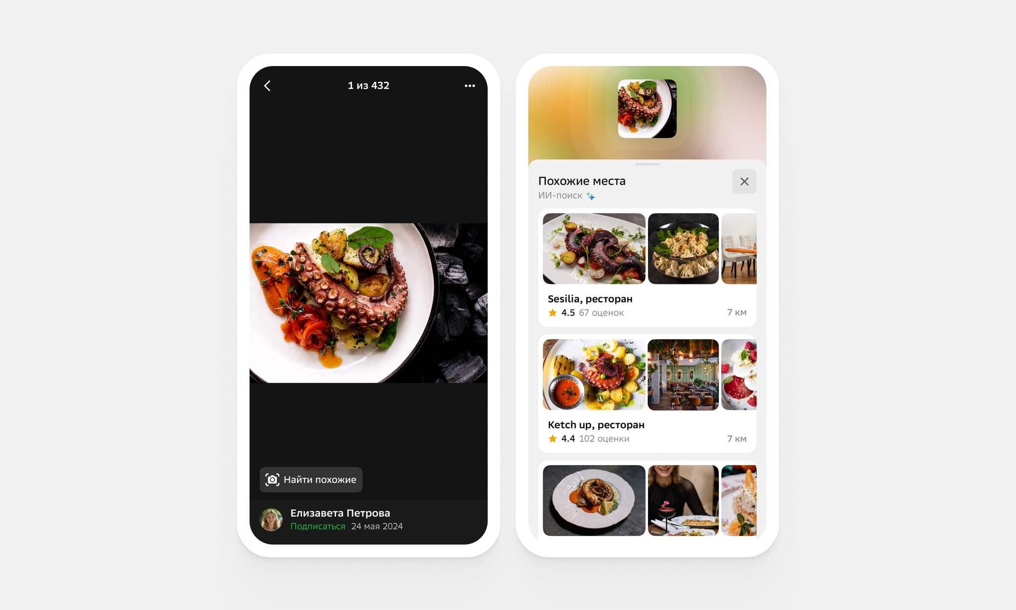 Увидел красивый интерьер или аппетитное блюдо в карточке ресторана? Нажми на «Искать похожее» на фото — и 2ГИС покажет похожие места. Это удобно, если ты выбираешь глазами, а не словами.
