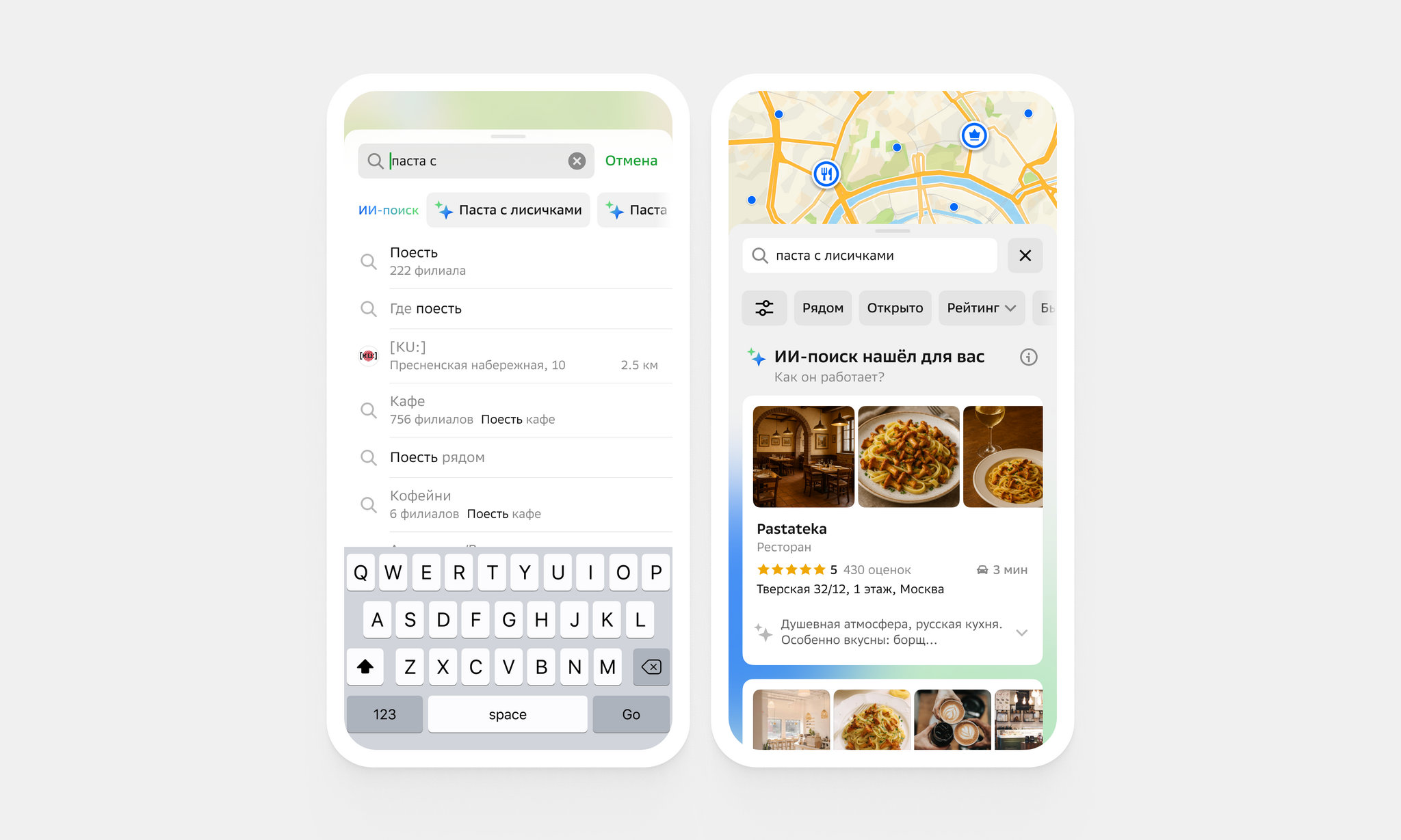 «паста с лисичками», «штрудель с мороженым», «мидии в сливочном соусе» — и получай список заведений, где можно попробовать это блюдо. А ещё под каждым местом будет краткое описание, составленное ИИ на основе отзывов. Чтобы не читать много текста, а сразу понять, стоит ли идти.