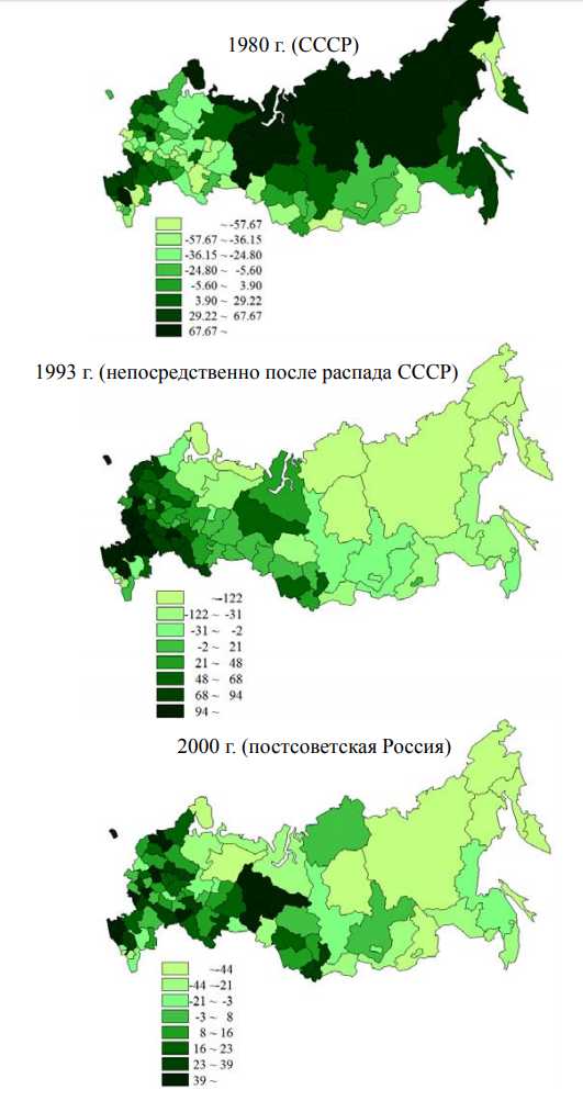 Чукотка, Магадан, вообще весь дальний восток и север - народ оттуда бежит - вот нашел картинку по миграции интересную. Видно что в советском союзе условно назовем их "стремные регионы" всегда были в плюсах (черным закрашены). Народ туда ехал на заработки, они там были очень высокими, давали жилье.