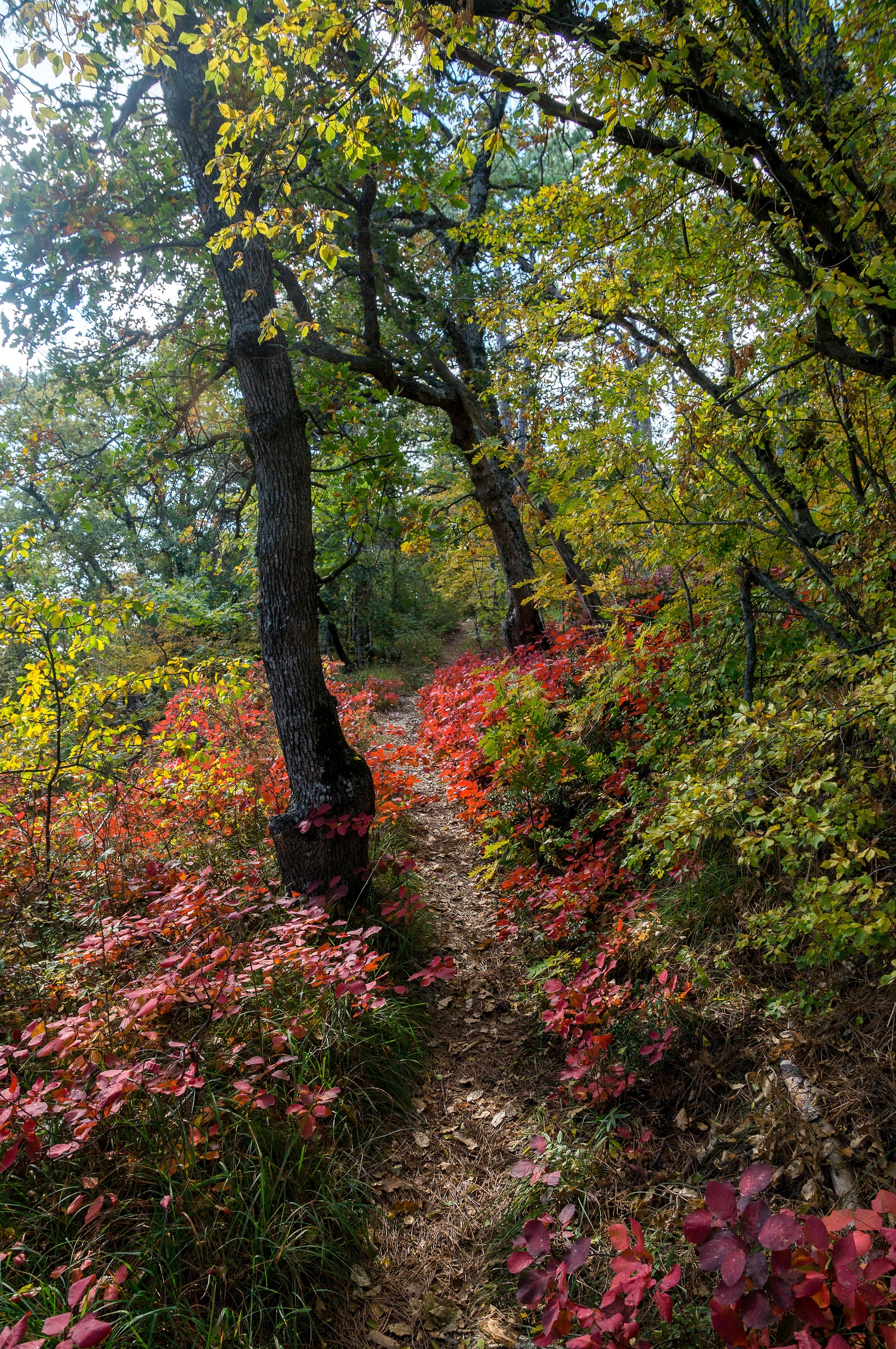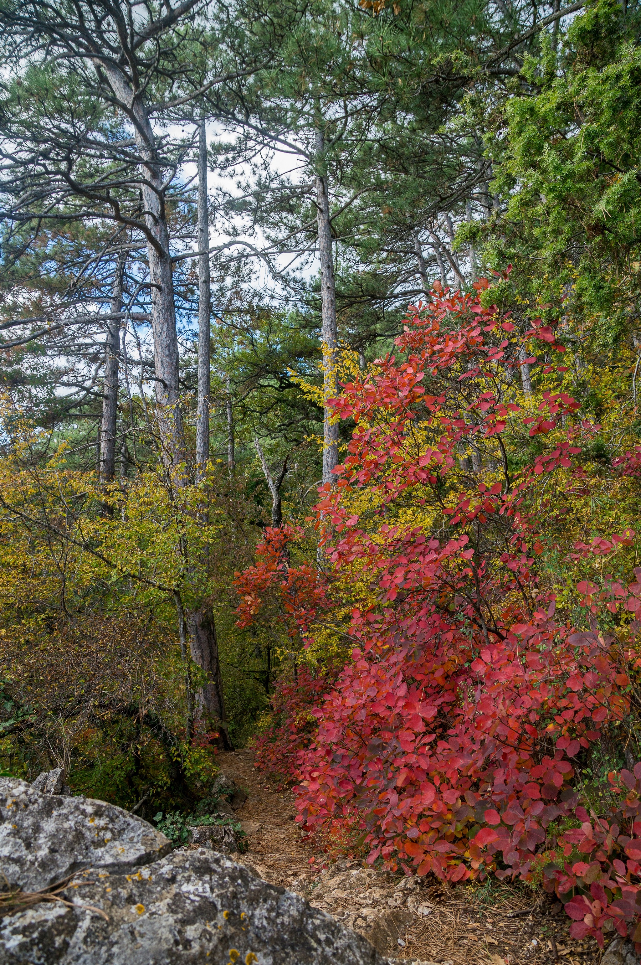 Тропа проходит по довольно густому смешанному лесу, где вместе с крымской сосной, грабинником, кизилом, пушистым и скальным дубом растут клён полевой, калина берека, а в подлеске — вечнозелёные кустарники иглица понтийская и жасмин.