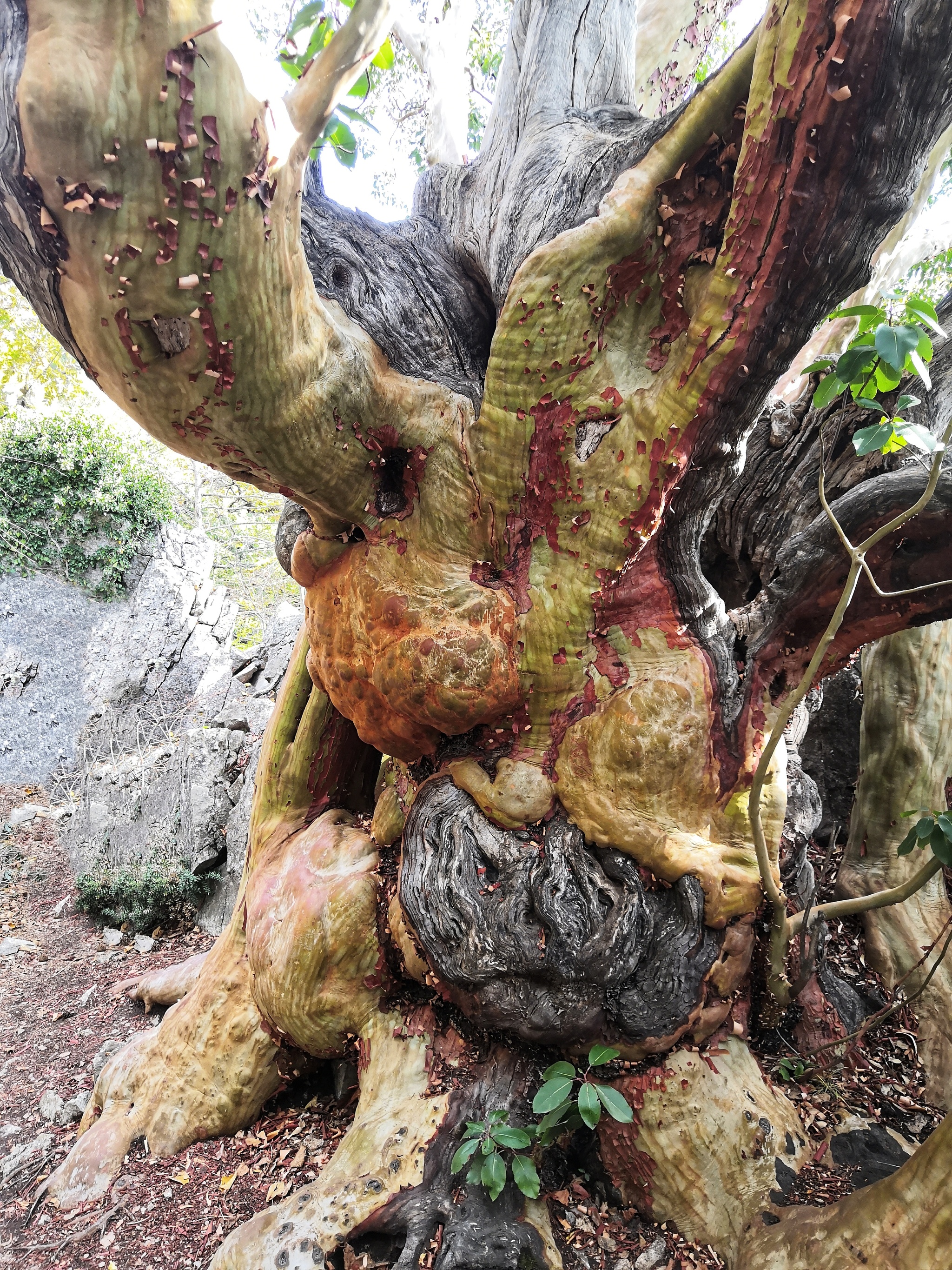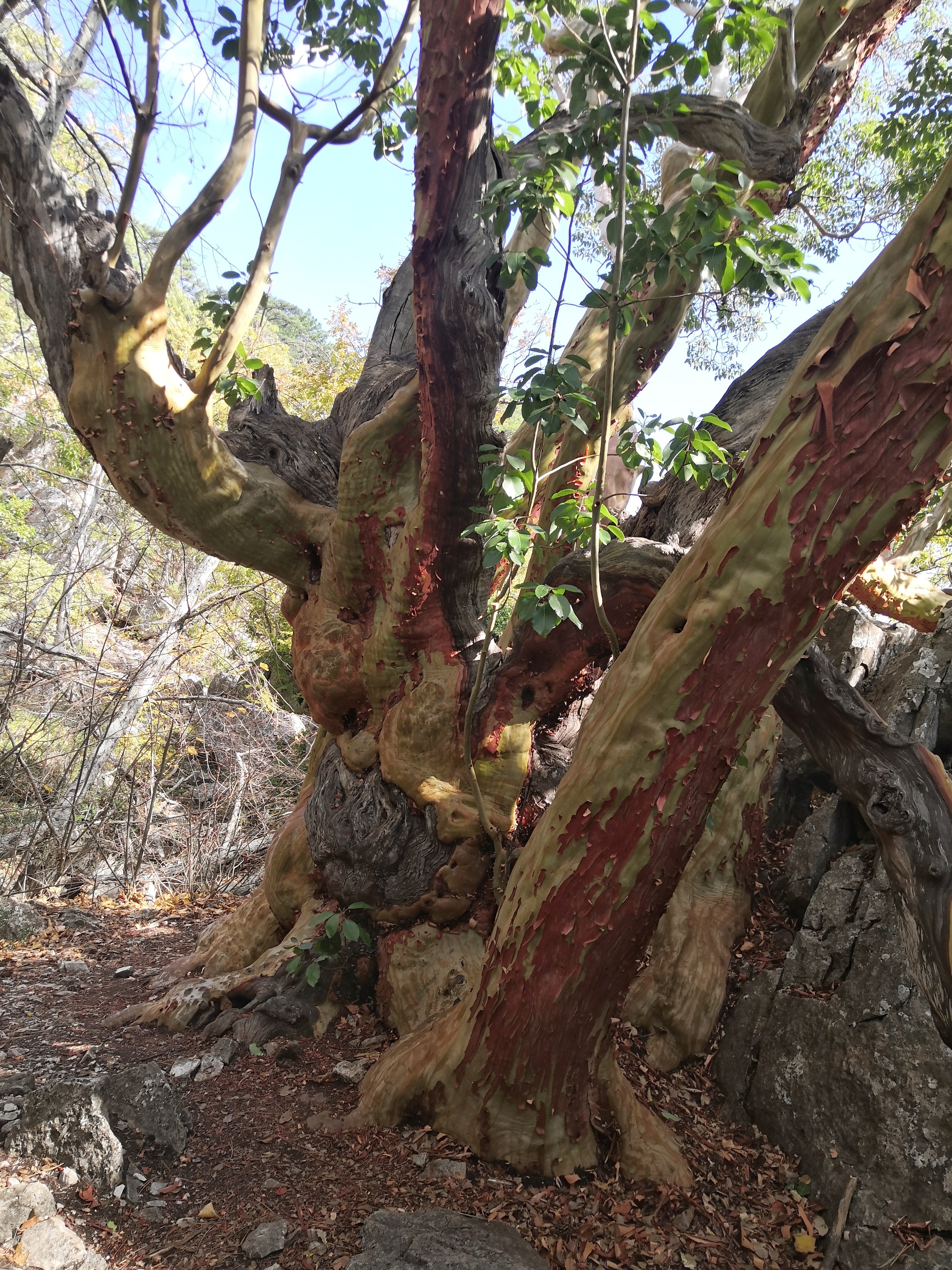 Оно относится к виду земляничника мелкоплодного, семейства Вересковые (Arbutus andrachne L., III). В зависимости от времени года, его кора бывает бежевой, розовой, оранжевой или коралловой. А жарким летом, прошлогодняя кора растрескивается и падает, обнажая ствол с нежной молодой корой оливкового цвета. За это явление земляничник носит народное название “Бесстыдница”.