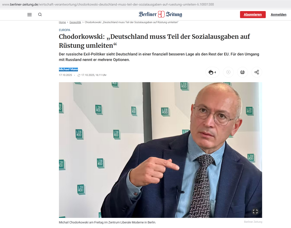 Противник Путина и российский оппозиционный политик Михаил Ходорковский считает, что странам Европы необходимо определиться с той позицией, которую они займут в отношении России. Ходорковский заявил на пресс-конференции в пятницу, отвечая на вопрос «Берлинер Цайтунг» о поведении Германии в свете двусторонних переговоров между США и Россией по Украине: «Германия должна вместе с другими европейцами задаться вопросом: удастся ли нам удержать США с их защитным зонтиком в Европе? Или мы хотим вести суверенные переговоры с Россией о признании территориальных приобретений?» Если Германия не добьётся успеха в этих шагах, населению нужно говорить правду: «Тогда Германии придётся перенаправить часть социальных расходов на оборону». Экономическое положение Германии несколько лучше, чем у других стран ЕС: «Германия по крайней мере ещё может брать кредиты, в то время как бюджеты других стран достигли своего лимита». Ходорковский находился в Берлине по приглашению Центра либерального модерна, где в пятницу, среди прочего, провел встречу с государственным секретарём министерства иностранных дел Нильсом Шмидом.