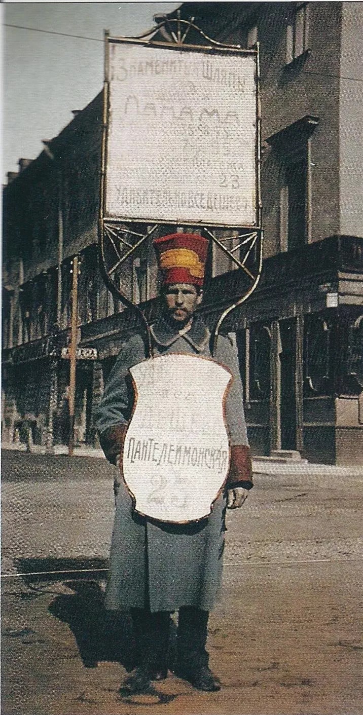 "После 1910 года на главных улицах появилась «ходячая реклама». Рядом с тротуаром один за другим шли тихим шагом обычно пожилые люди в одинаковых коричневого цвета пальто с металлическими пуговицами и такими же фуражками. Они несли высокие рамы из бамбука, на которые были натянуты полотнища с рекламными объявлениями. Обычно это была реклама кинотеатров, цирка. Иногда каждый нес друг за другом только одну букву, а было их человек 20, и прохожий мог, переводя взгляд от одного к другому, прочесть целую фразу: «Сегодня все идите в цирк»."