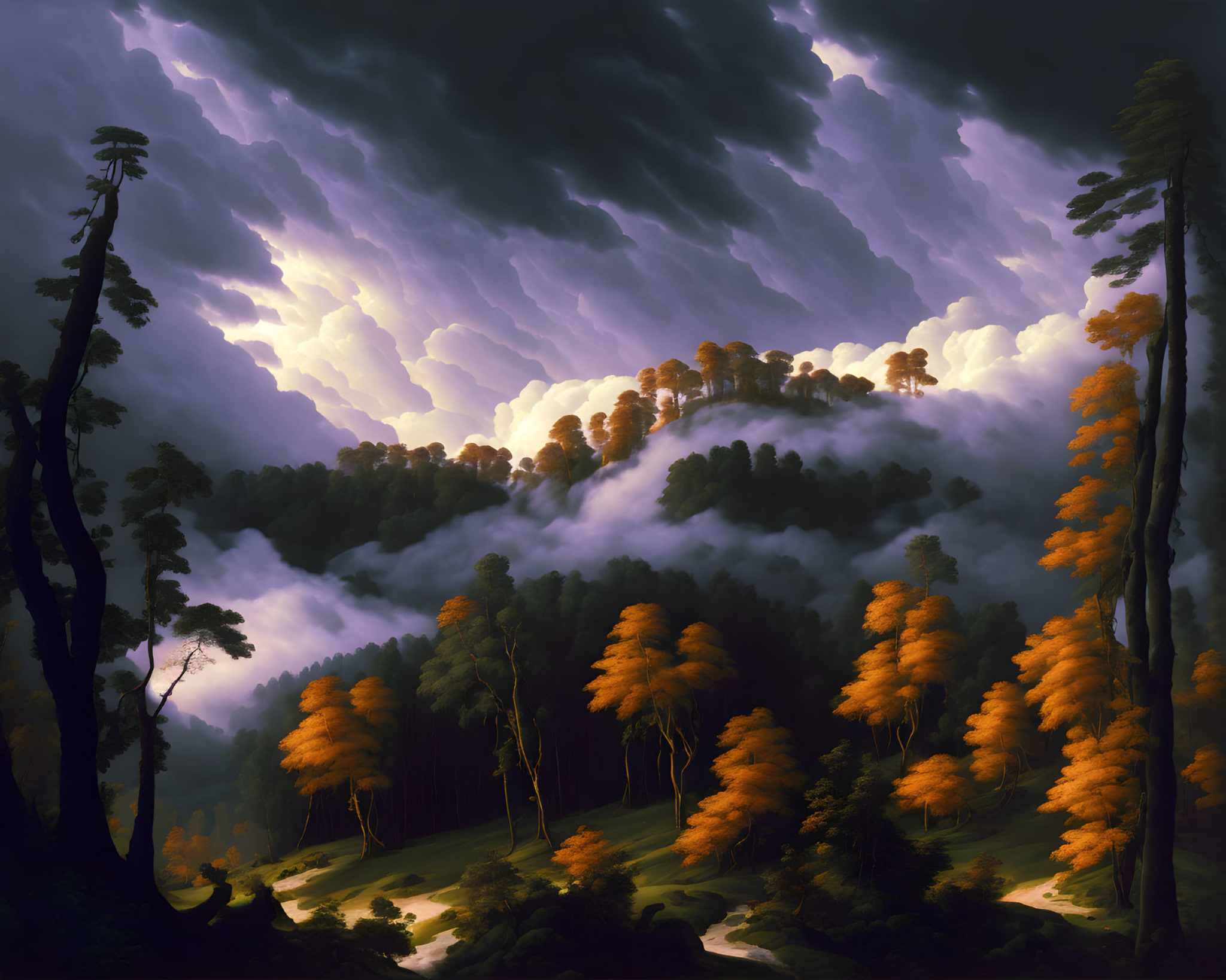 Prompt: Fine oil painting of a brooding cloud of memories wanders over the forest of the forgotten. Oil painting by Michelangelo.