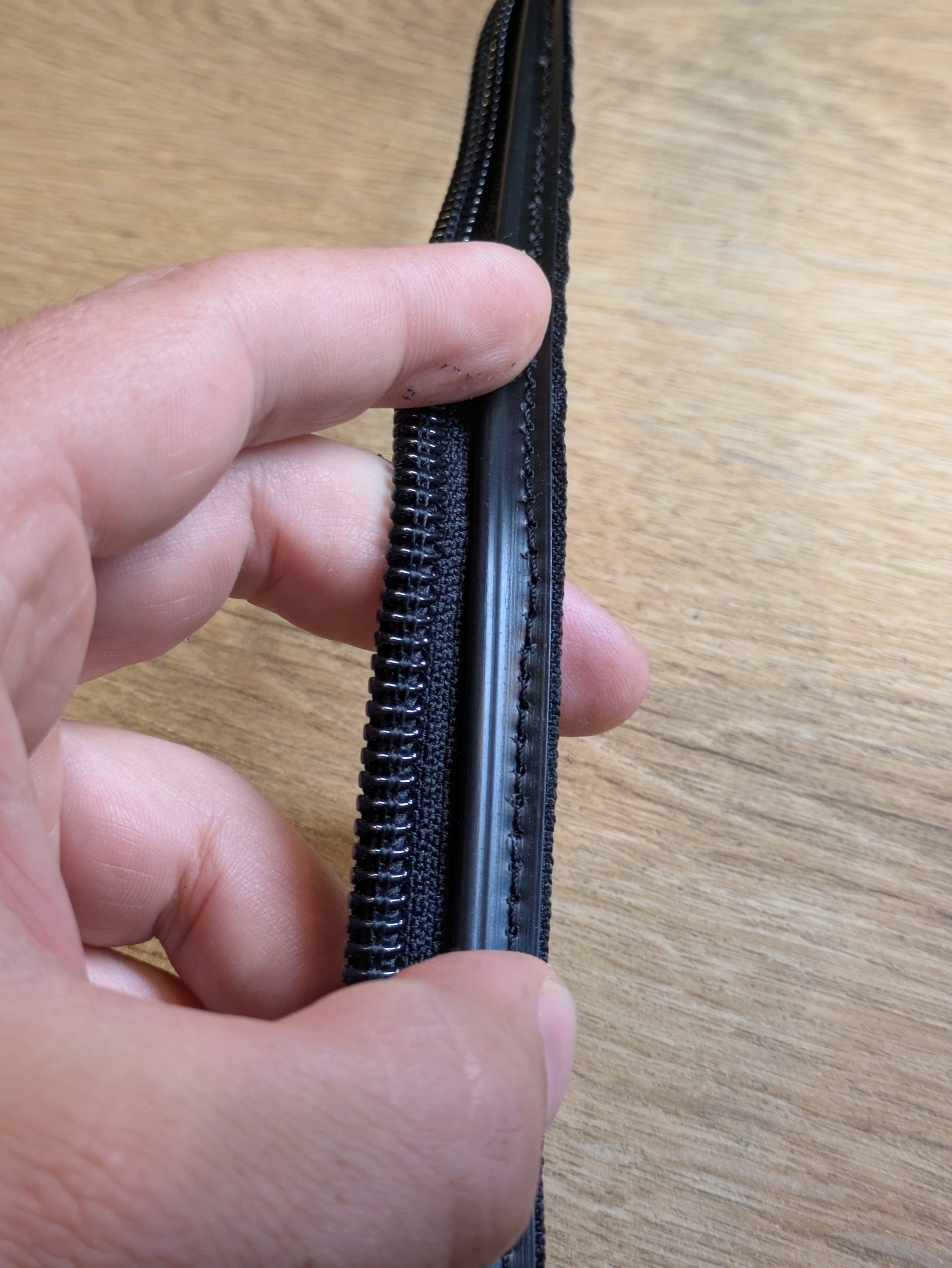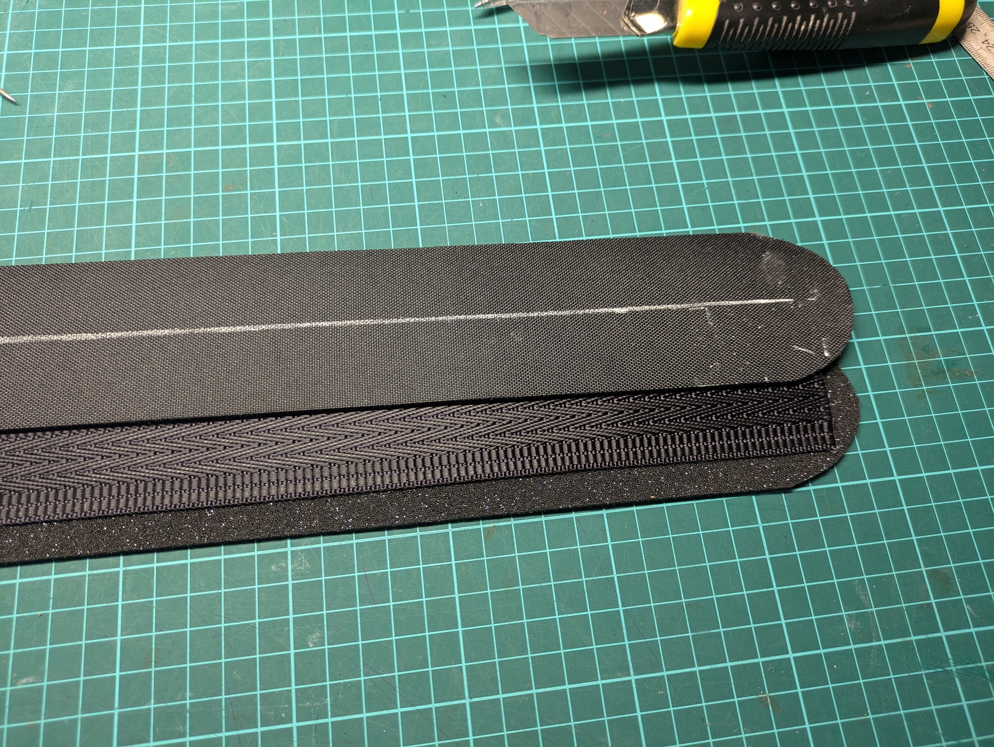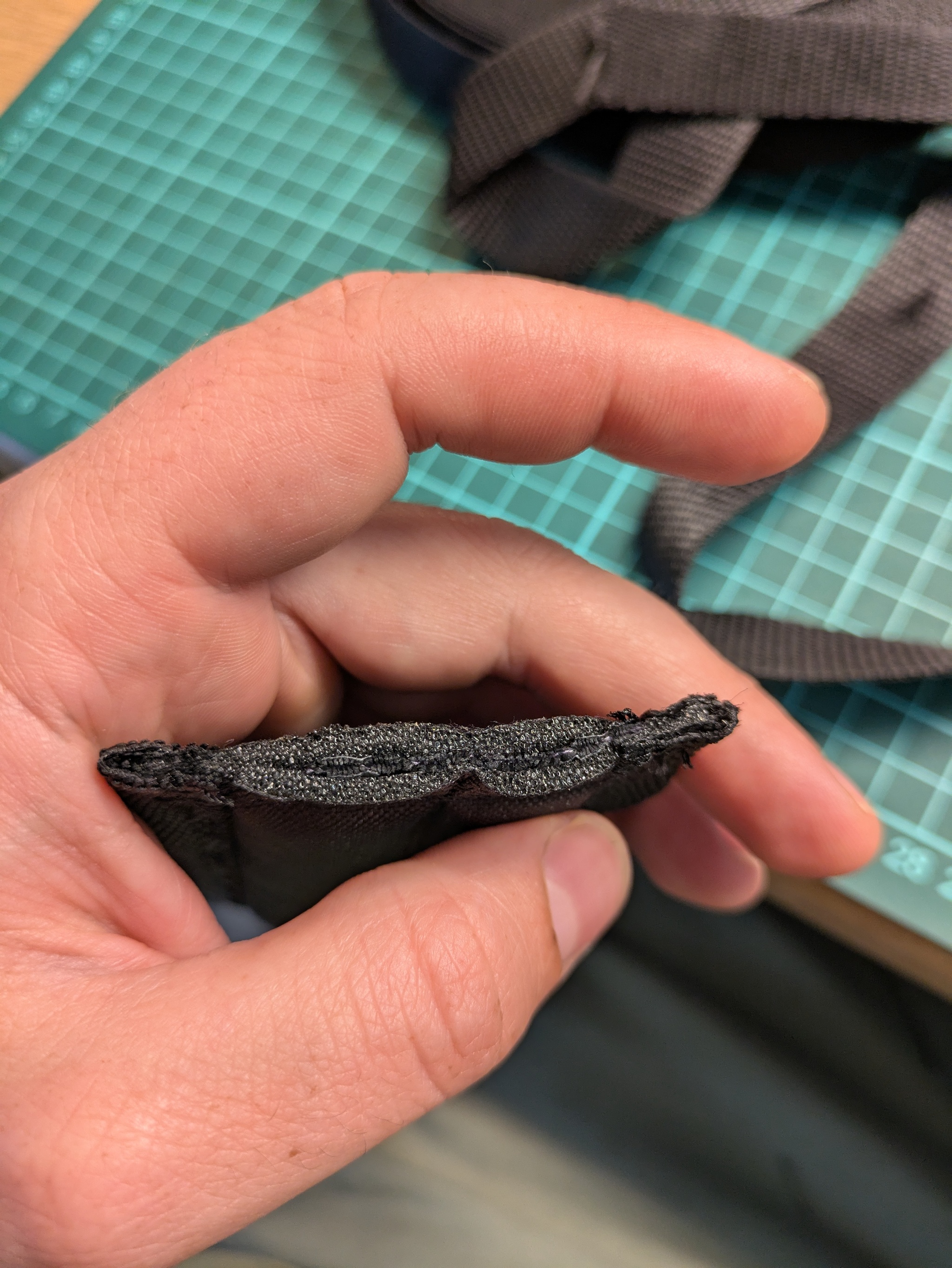 Вот такой пирог получился, ткань/пенка/стропа/пенка/ткань.