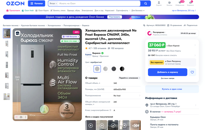 С доставкой и получением никаких проблем не было. Озон доставка, курьер доставил прямо в квартиру. Все четко. Оставляем на 4 часа холодильник после транспортировки.