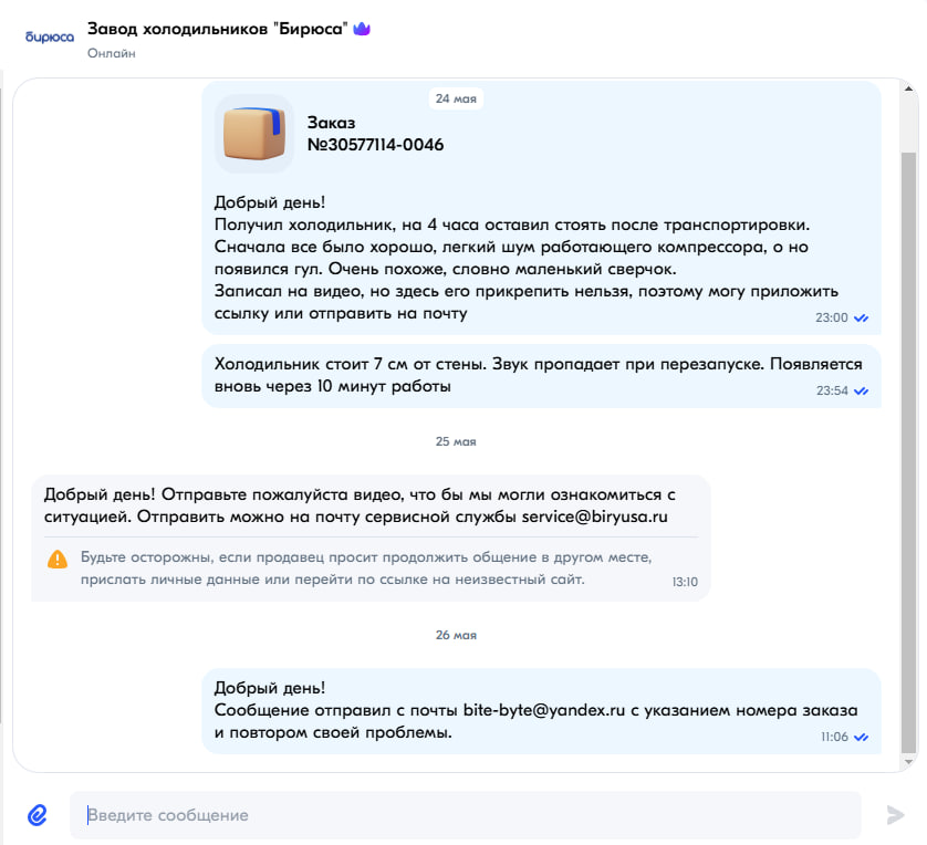 После включения, расстановки продуктов и наклейки магнитиков первые пару часов все было нормально. Но в какой-то момент появился "сверчок". Очень сильно давящий по ушам. Немного решил подождать. Мало ли этому устройству надо пройти некую "обкатку" и звук пропадает. Ближе к ночи стало ясно, что звук только нарастает. О чем я решил сразу написать продавцу. Все таки удобно, что и продавец и производитель - одно лицо. Написал на Озоне, чтобы зафиксировать, что было обращение.