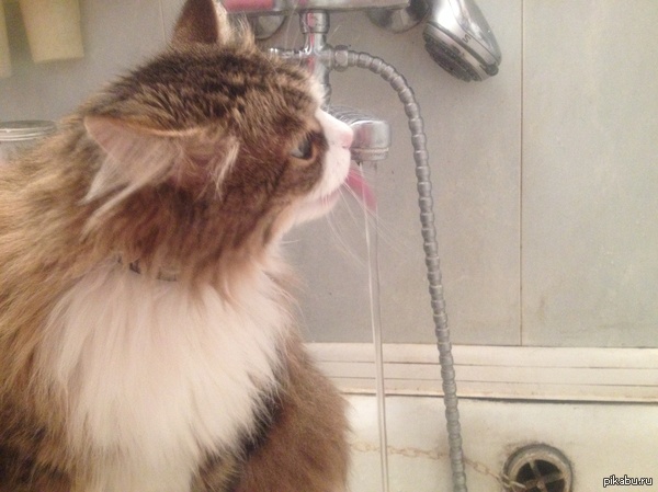 Старичок предпочитает пить только свежую воду из-под крана. Садится на стиралку и ждет, когда включат ему водичку, из миски не любит пить) P.S. Васе уже 13 лет