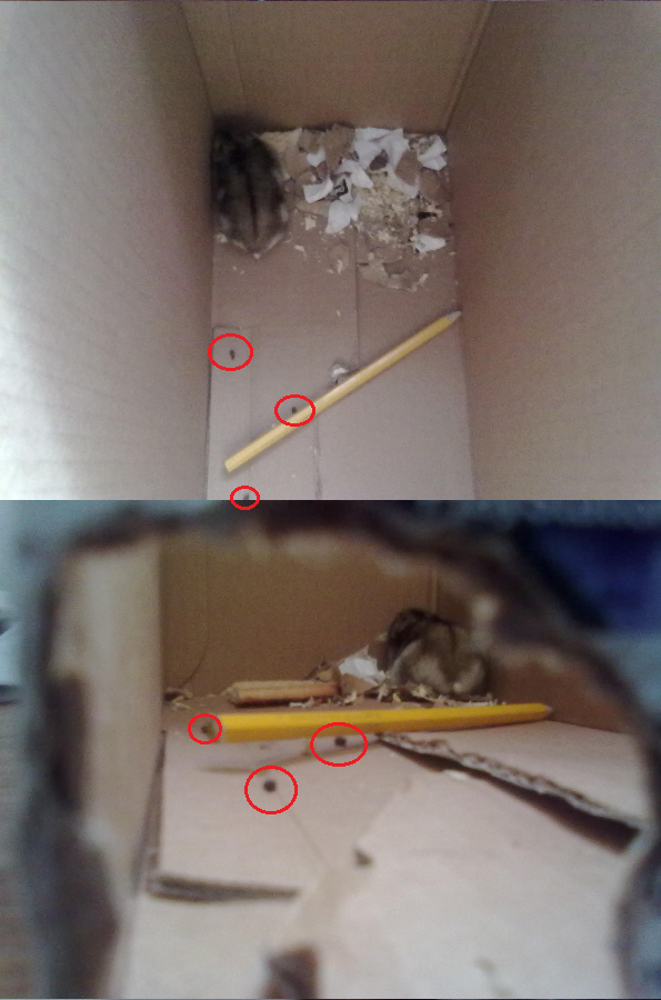 Как я уже говорил, комната заставлена и в ней никто не живет, это как кладовка, карандаш наполовину съеден, да и коробка порядком пострадала, а ел и пил он видимо на кухне, а там хватит грызуну. И у меня, видимо, воспитанный хомяк и какает не там где ест, хотя может он перебрался в эту коробку недавно, а жил где-то еще, нужно разобрать завалы:)