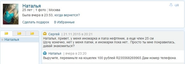 morfua 9 лет назад Хорошая попытка Вот так я написал одной девушки, в Питере, на сайте знакомств. Пробиваем кошелек по сайту WebMoney. И видим что "оно" зарегестрировано на: а жаль... [моё] Знакомства Развод Девушки Мужчины