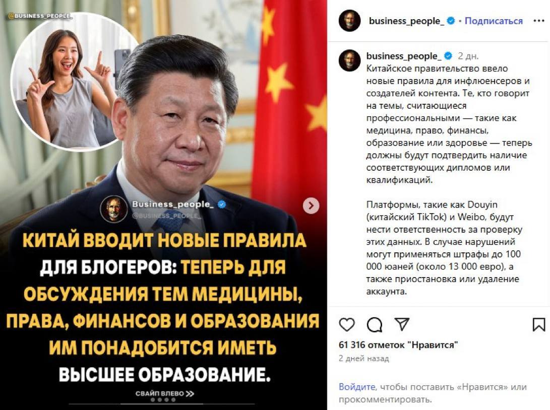 Прошлый пост удалили из-за отсутствия ссылок. Вот https://tenchat.ru/media/3943297-kitay-vvodit-diplomy-dlya-b... https://finratings.kz/news/8281-v-kitae-vvodiat-novye-pravil... https://vfokuse.mail.ru/article/v-kitae-u-blogerov-ekspertov...