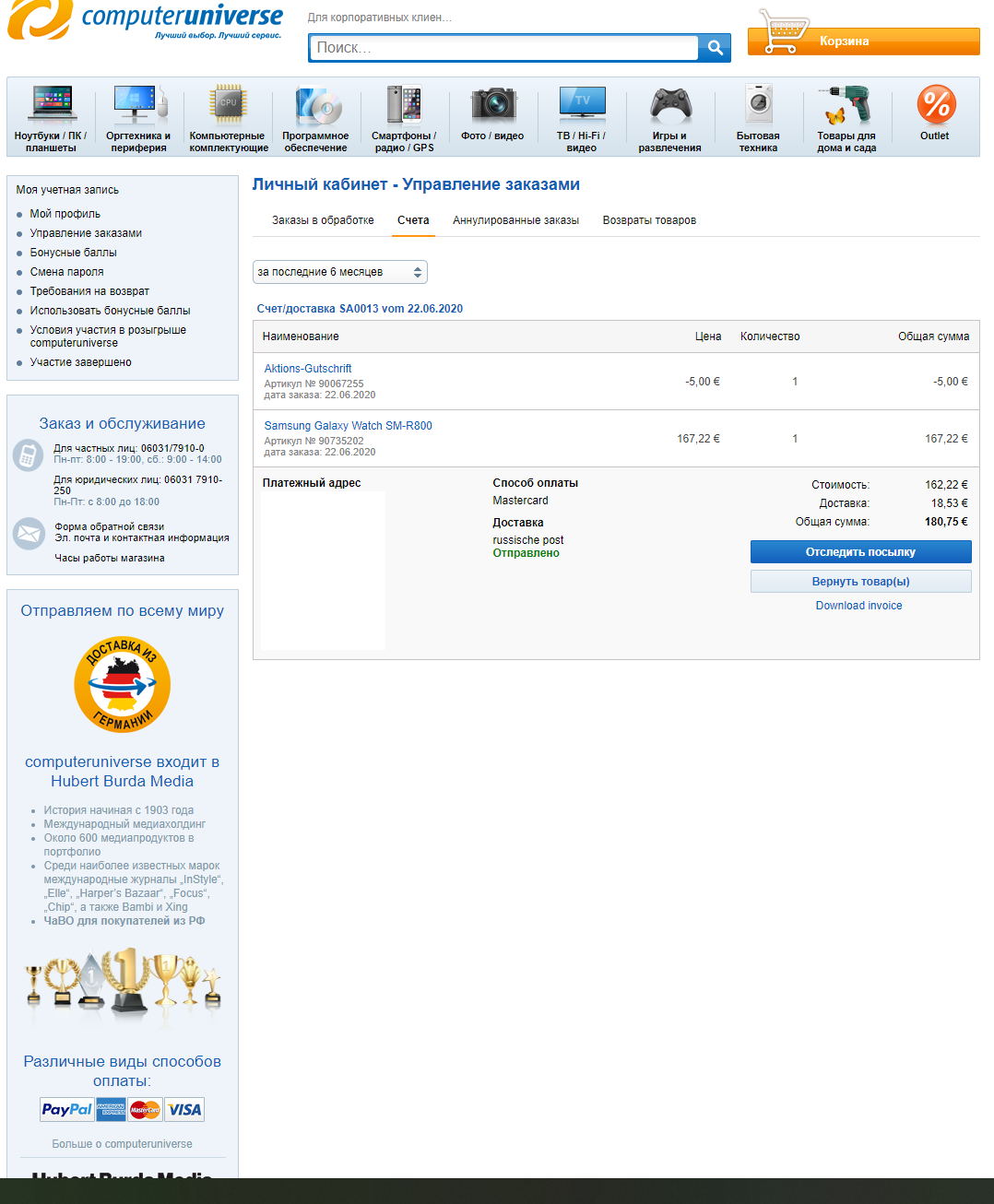 И вот уже практически 2 месяца, никто в этом немецком магазине не может мне сказать где мои часы. Вернуть деньги, тоже не представляется возможным, т.к. оплачивал с карты.