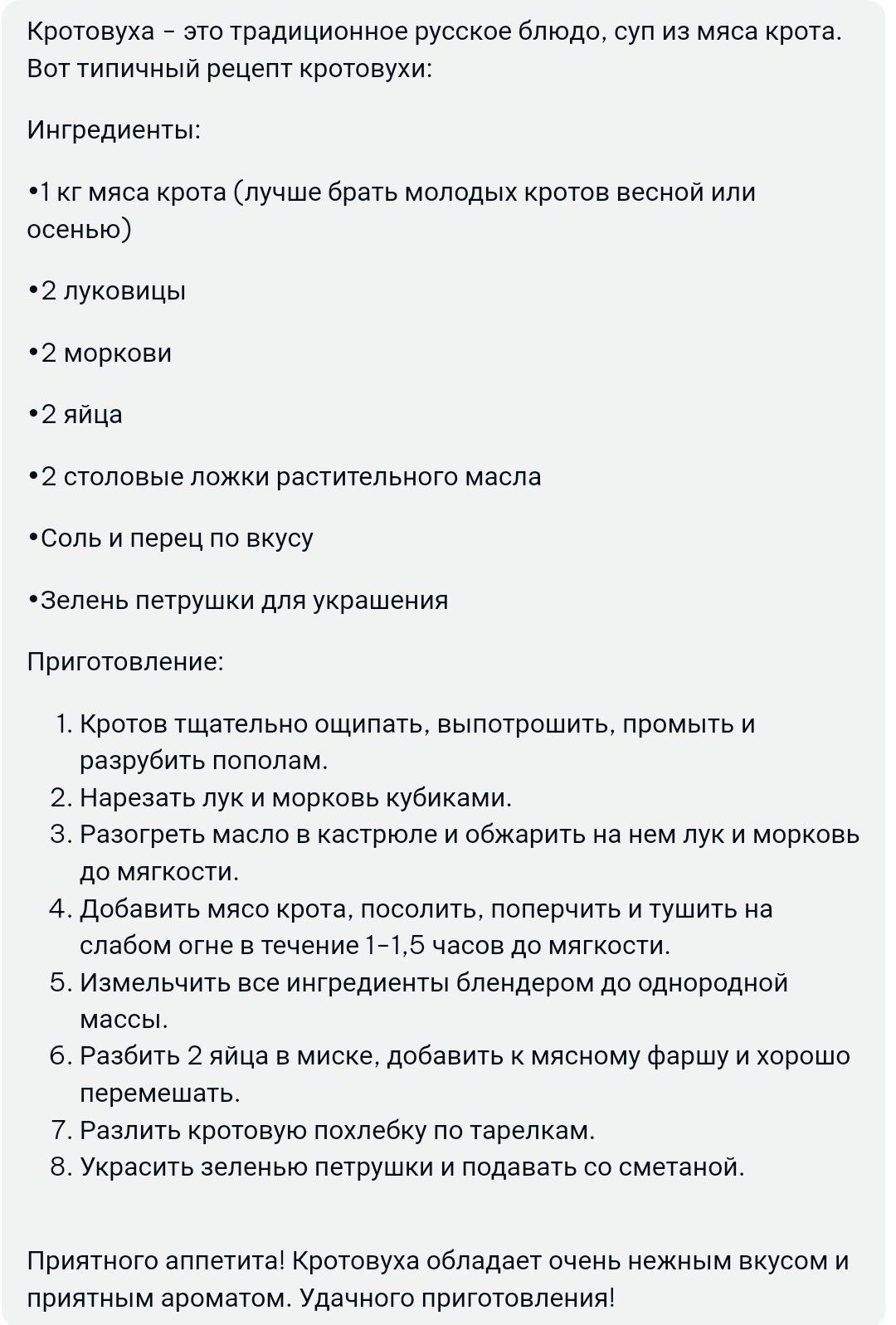 Almadiero Хозяйке на заметку 2 года назад Вот какой рецепт кротовухи мне выдала нейросеть с сайта https://poe.com/ Нейронные сети Рецепт Кротовуха 1 Ещё 0