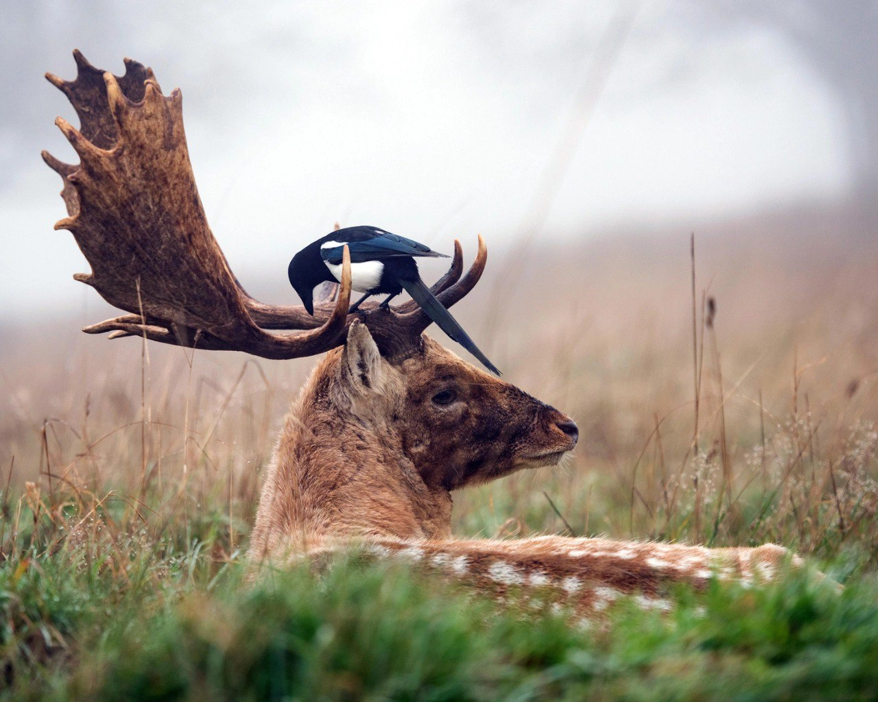 Фотограф Макс Эллис во время прогулки по Ричмонд-парку увидел сороку, сидевшую на раскидистых рогах лани. Проворную сороку привлекли клочки шерсти, свисающие со шкуры линяющего оленя, — это прекрасный строительный материал для гнезда.
