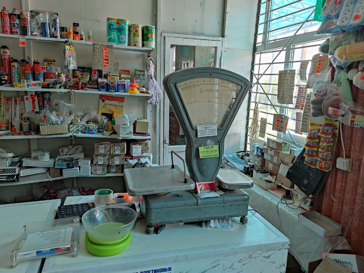 Заходим в магазин и наблюдаем стандартную совковую обстановку, меня аж ностальгия пробила, как будто попал в другую реальность! Товар стоял на каких-то самодельных полках, был подвешен на гвозди и какую-то сетку.