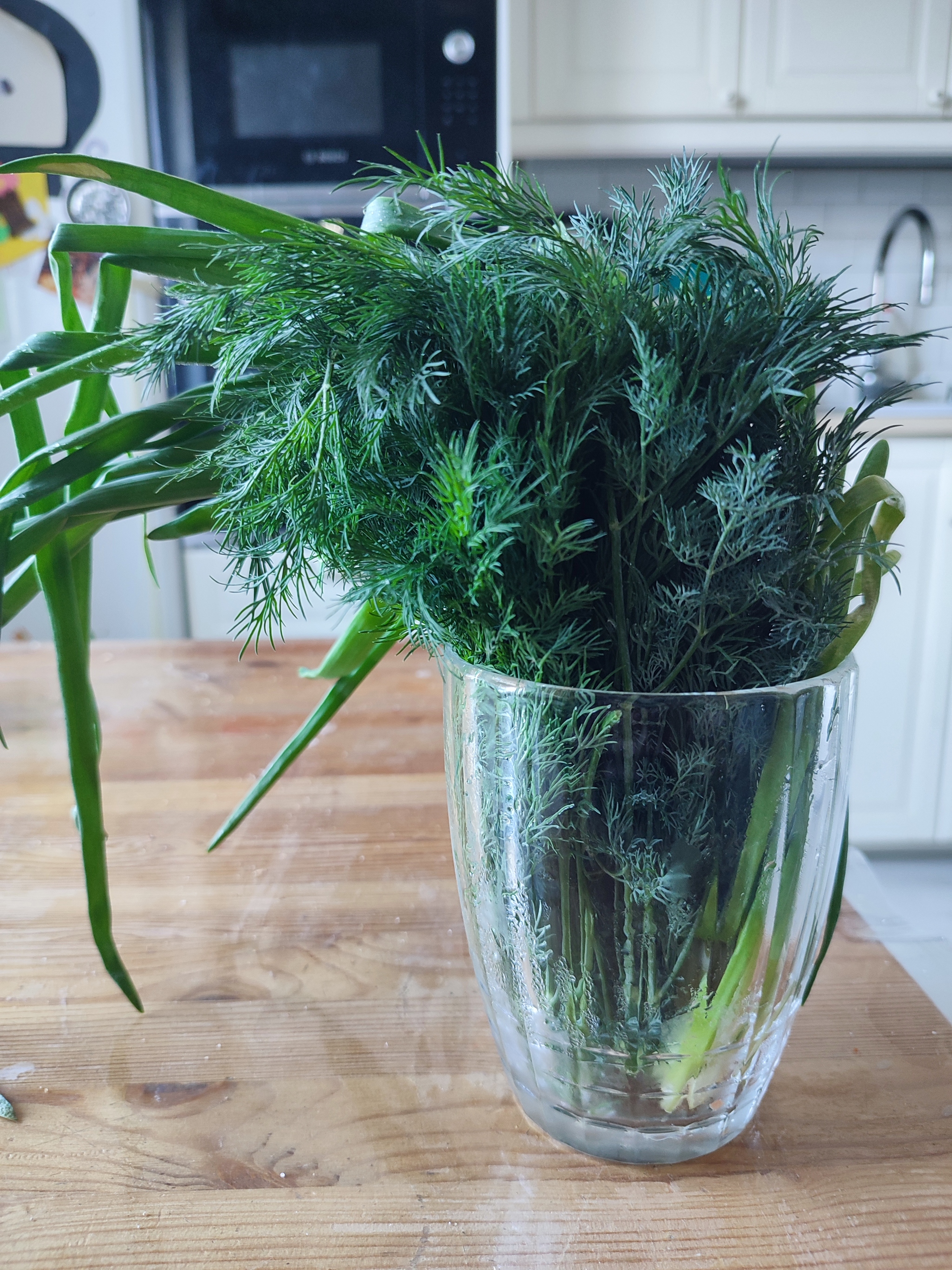 Может кому то пригодится. В моей семье зелень ем только я, так что расход ее не большой. Чтобы она не вяла, храню ее так. Пучок зелени сбрызнуть водой, поставить в высокую кружку, например пивную, сверху надеваем пакет и в холодильник. В таком виде зелень спокойно хранится 2-3 недели. Больше не пробовал–съедал ) Пучку на фотографии вторая неделя.