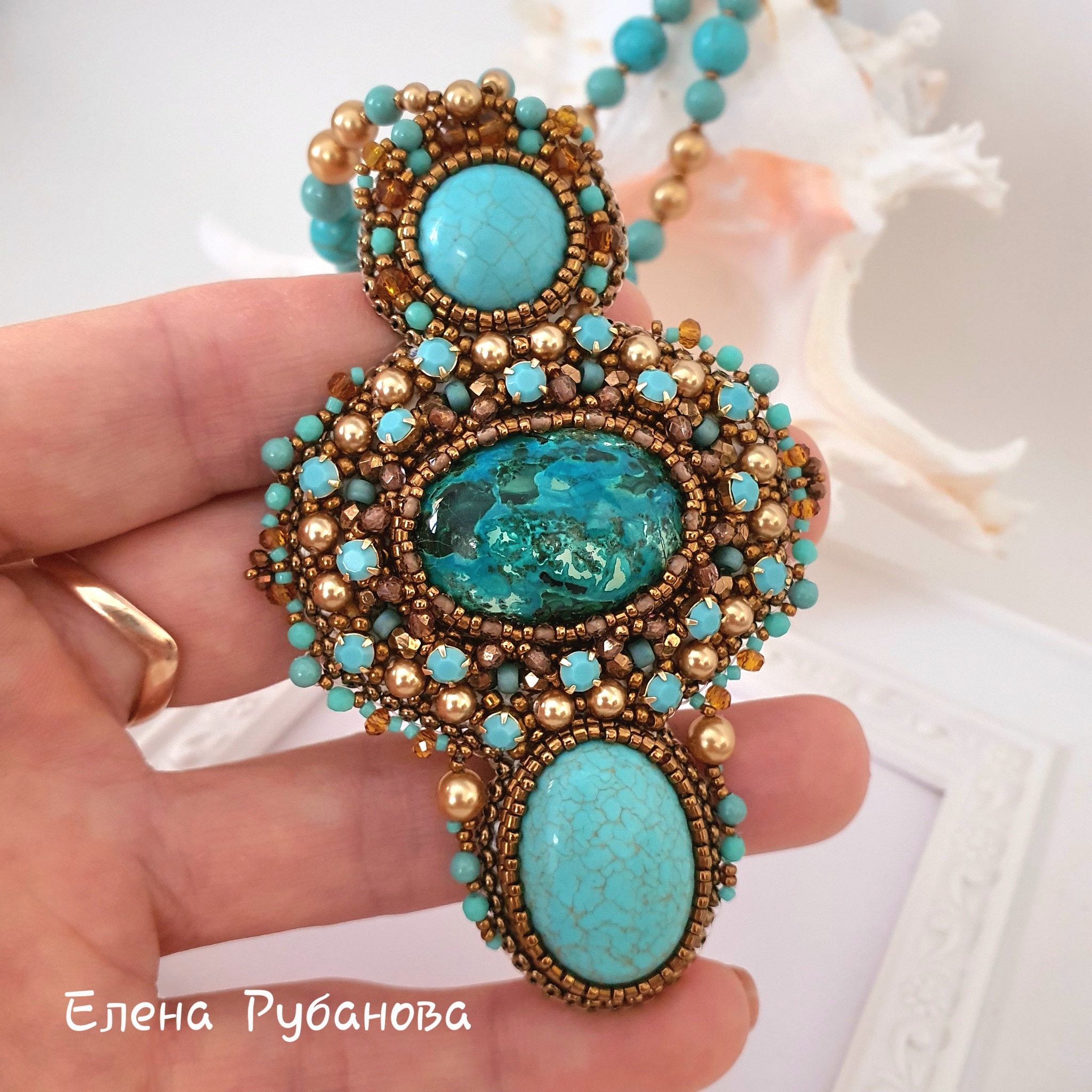 Использованы хризоколла (центральный камень) и бирюза прессованная, жемчуг Сваровски, бусины под бирюзу и стеклянные, японский бисер, обратная сторона натуральная кожа.