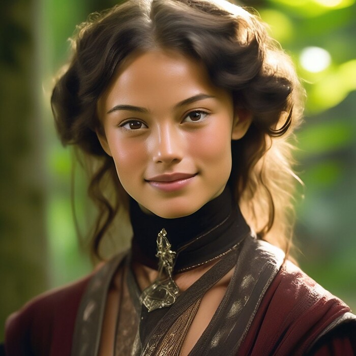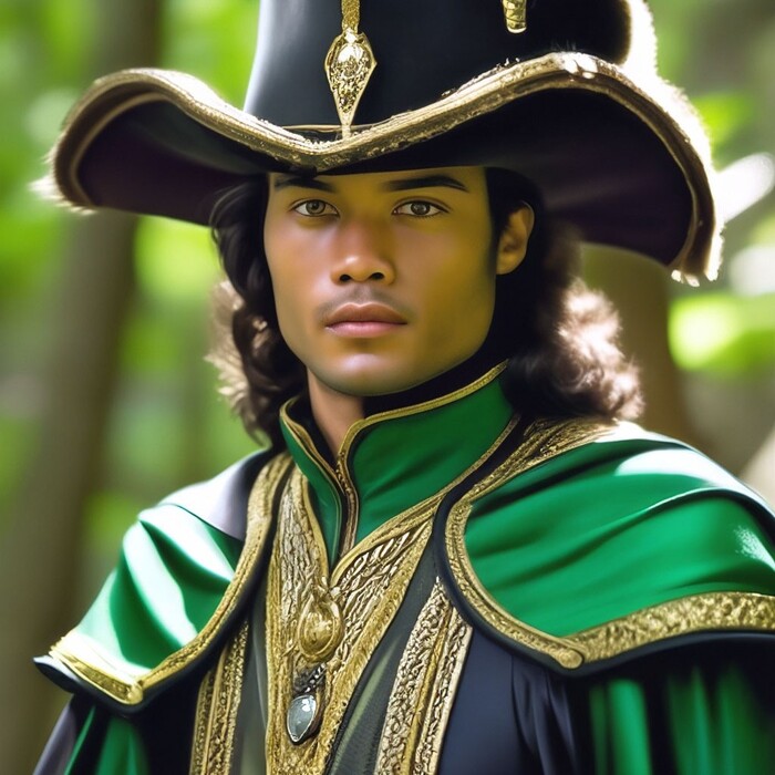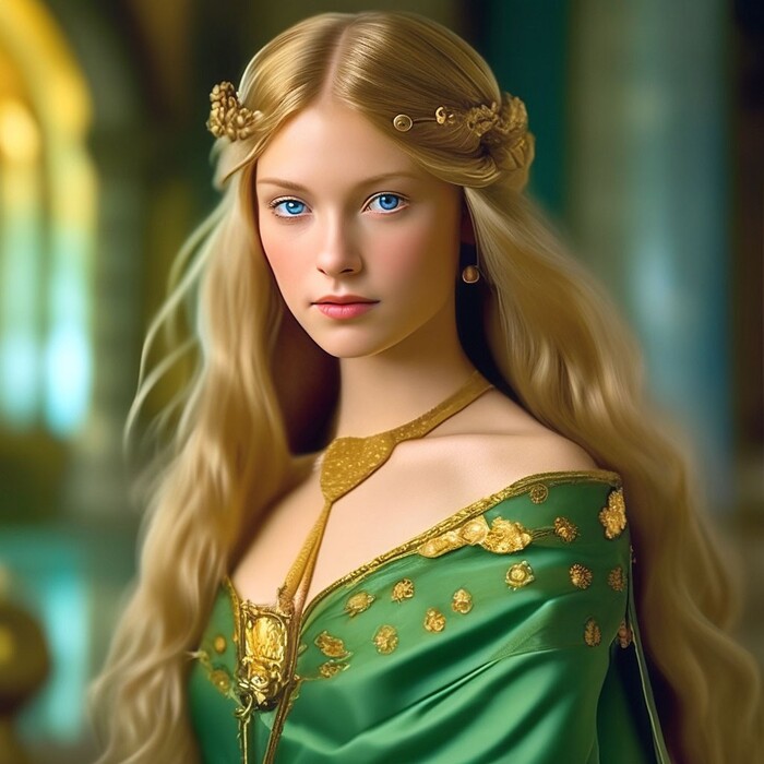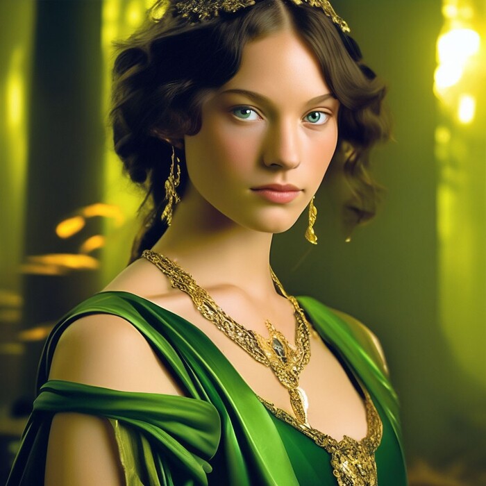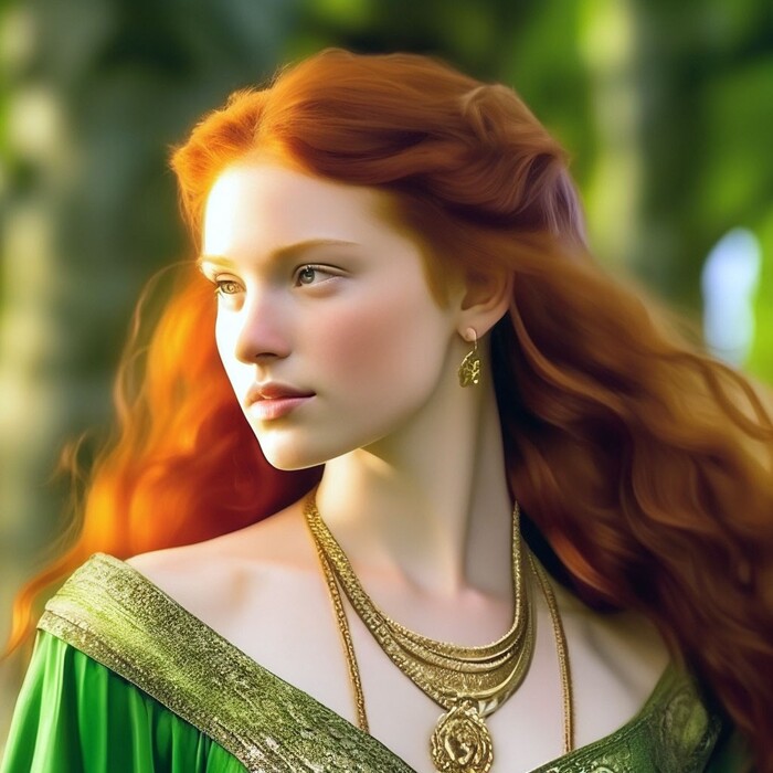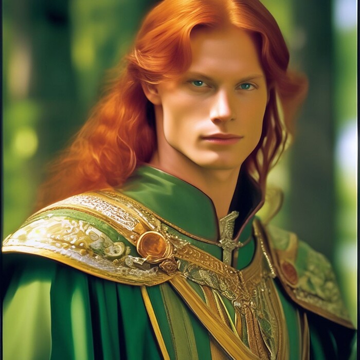 В описании ещё есть "зелёные глаза", но Шедеврум упорно красил в зелёное вообще всё - одежду, фон, поэтому пришлось убрать из описания.