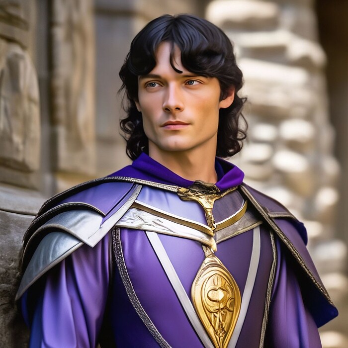 Корвин - принц Амбера, чёрные волосы, одежда чёрная с серебром, с чёрным плащом, на вид лет тридцати, цвета — чёрный с серебром, серебряная роза.