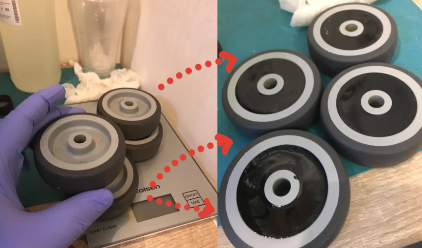 Ну колхозить, так колхозить. Покупапаю 4 колеса (менять все 4, чтобы не было вопросов у покупателя), эпоксидку ЭД-20, чёрный колер для эпоксидки (чтобы выглядело менее колхозно). И заливаю ступичный торцевой паз эпоксидкой с обеих сторон. Жёсткость колеса увеличивается в разы, грузоподъёмность также. По ширине, конечно, уже. Шайб поставил и стало всё ок.