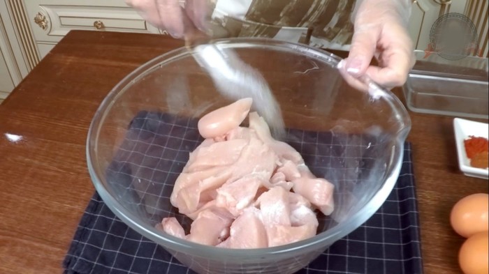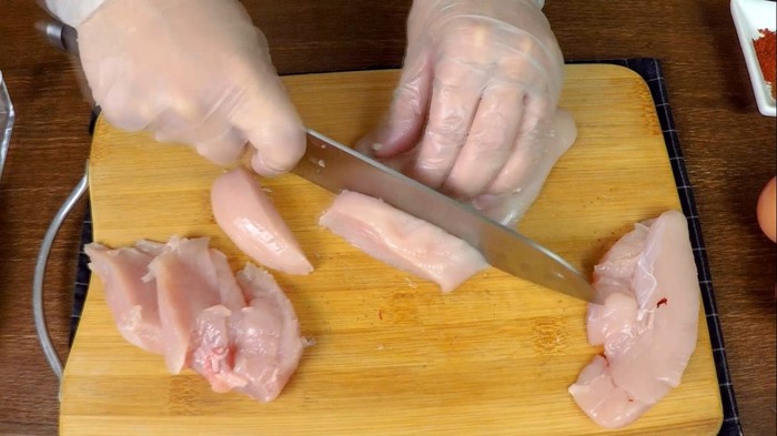 Разрезать пополам каждое филе и нарезать на полоски. Форма может быть любой, как вам нравится. Посолить по вкусу. У меня это 1 ч.л. Тщательно перемешать.