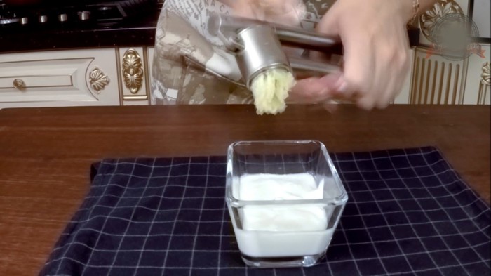 Сметану я взяла 20 % жирности. Чеснок натереть на мелкой терке или пропустить через пресс. Перемешать со сметаной. Соус готов. Подавать вместе с курочкой.