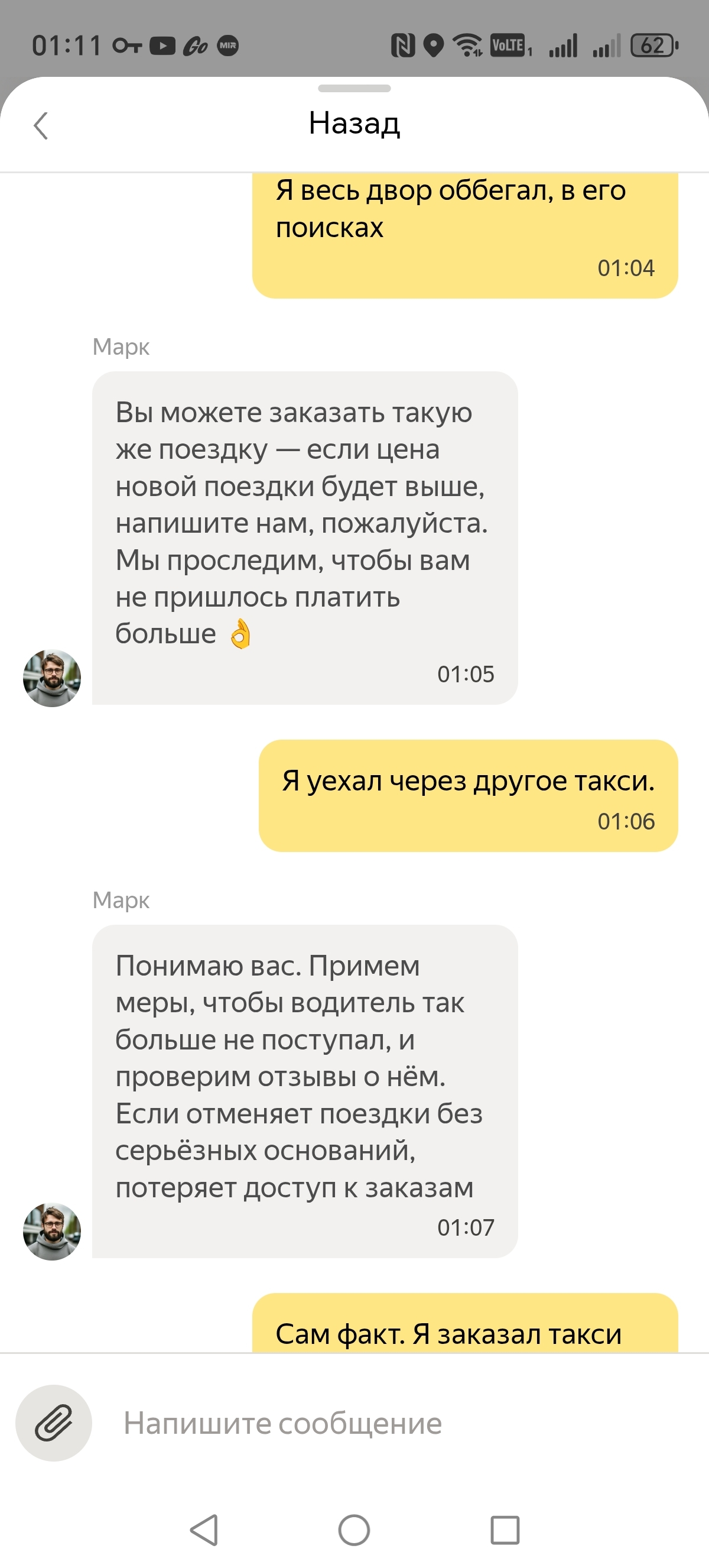 Решил я тут выпить с друзьями, и когда вечер был окончен, заказал такси яндекс до дому, до хаты. Наличку не ношу, поэтому привязал карту (честно сказать, ругаю себя за это, всегда за Наличку ездил, но тут не оказалось.) приезжает такси, куда-то и включается платное ожидание. Я оббегал весь двор в поисках машины, но мундак видимо встал дальше. Отменяю заказ.. И с меня списываются деньги. Через ебанный нахуй в поддержке деньги возвращаю. Но становится интересно... Я заказ сделал, меня пытались кинуть, деньги списали, вернули, я потратил время нервы, и в итоге уехал через другое такси... В итоге решил, ну мало хоть промокод дадут, как компенсацию.... Но яндексу похуй...