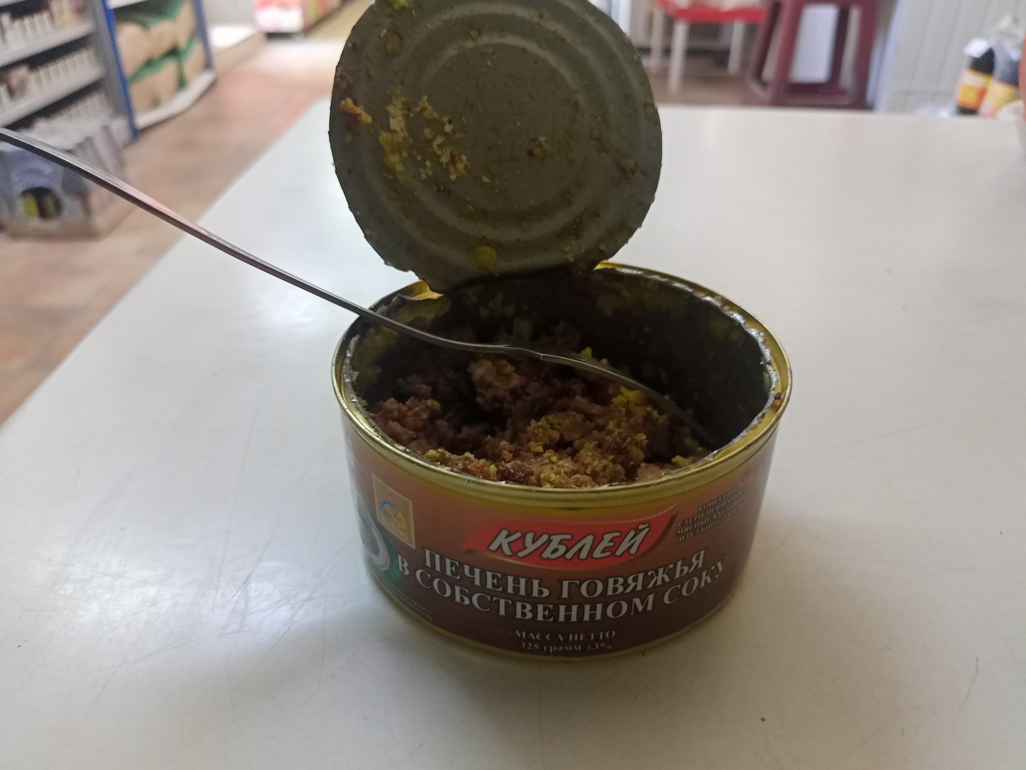 На работе попробовал казахские консервы "Печень в собственном соку". Очень понравилось! Сытная. Взял домой и поужинал ею и двумя варёными яйцами.