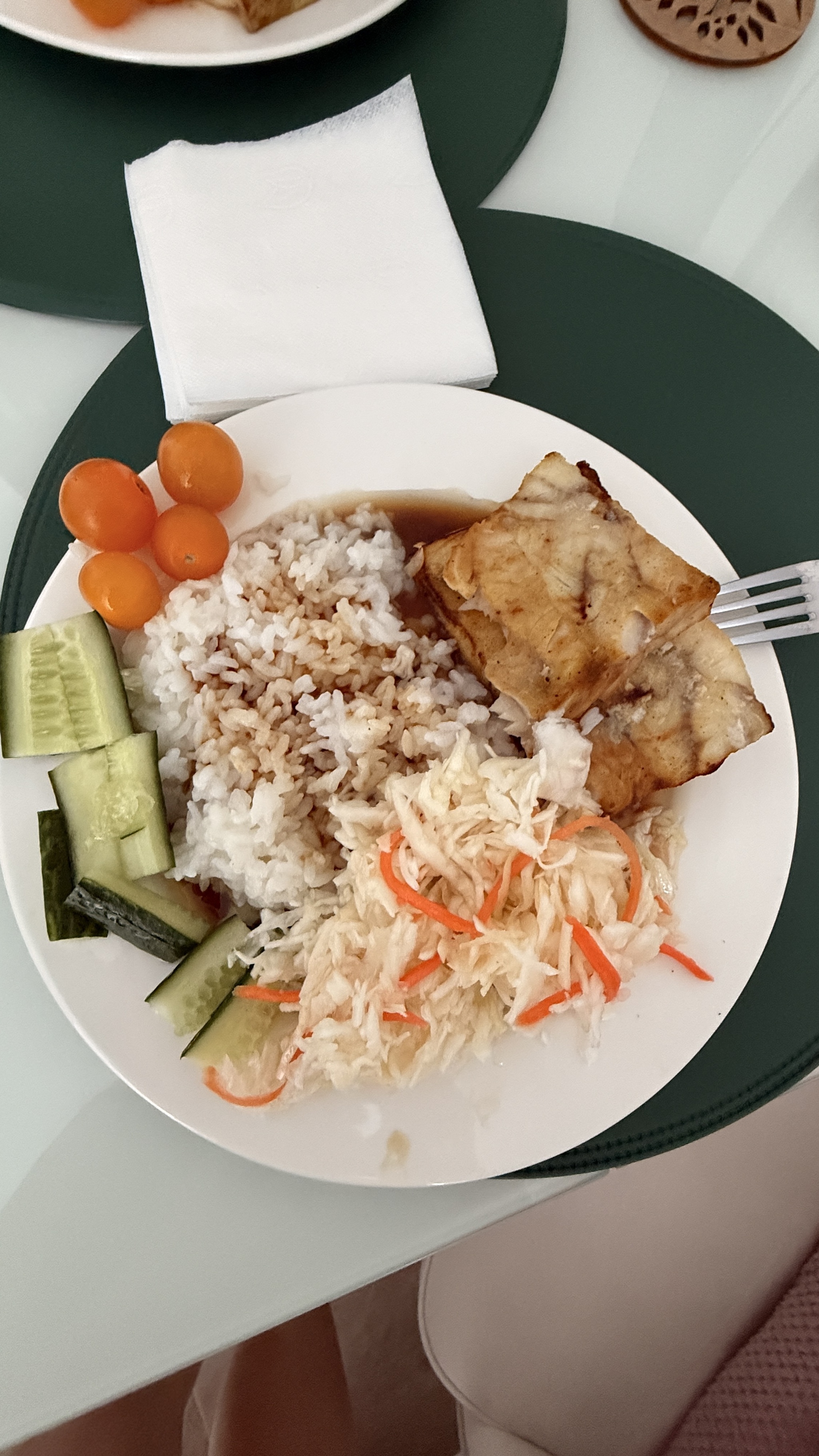 На обед филе минтая из чижика в аэрогриле,рисок с соевым из мультиварки,капуста квашеная,немножко овощей. Обожаю быть ленивой хозяйкой. А минтай в брикетах очень вкусный