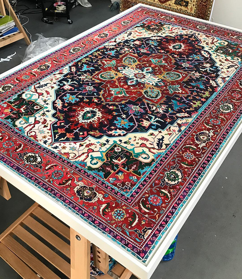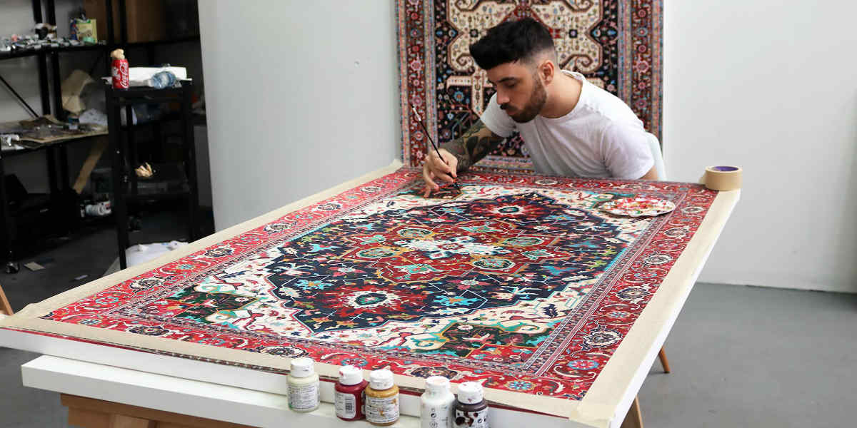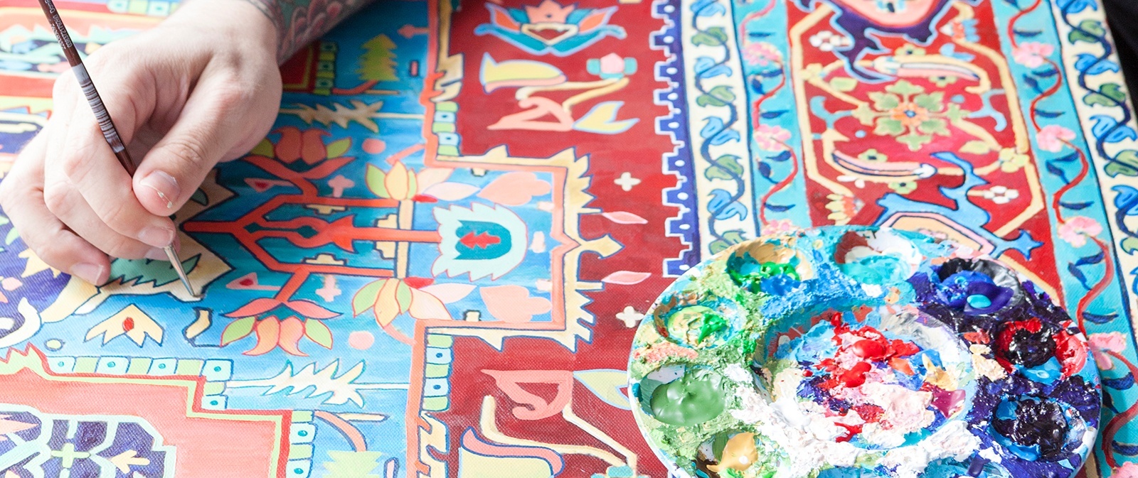Джейсон старается возродить эту практику в собственной интерпретации. Он воссоздаёт замысловатые узоры старинных напольных и настенных покрытий в смешанной технике акриловых красок и гуаши.
